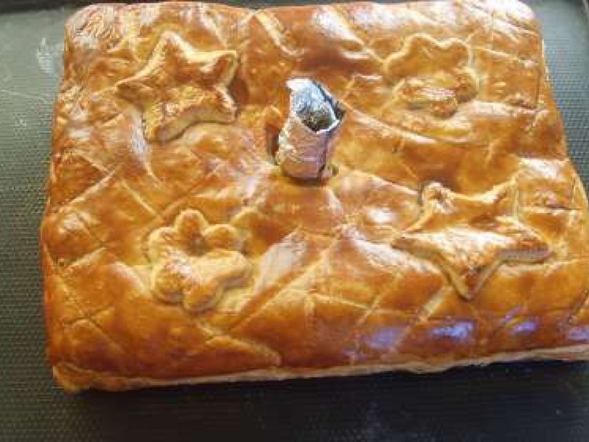 Le jour même : Divisez la pâte feuilletée en 2, environ 300g/200g. Etalez le morceau de 300 g afin d'avoir une abaisse de 35 cm de long environ et de 20cm de large. Etalez le deuxième morceau de pâte feuilletée mais elle doit être plus petite, d'environ 30 cm de long.