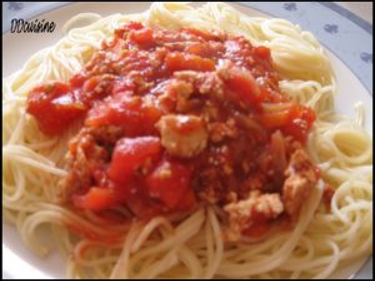 Pâtes à la bolognaise au tofu Platfacile15 min449 Kcal Envoyer cette recette à un ami Imprimer cette page Poser une question à l'auteur Publier votre photo de cette recette Ingrédients 2 quantité de pâtes selon votre appétit 125 g de tofu 2 petits oignons 1 petite carotte 1 branche de céleri coulis de tomates 100 % tomate 1 boîte de tomates pelées 1 verre de vin blanc 1 à 2 càs d'huile d'olive sauce soja herbes de Provence sel et poivre Coût estimé: 3.48Euros€ (1.74€/part)