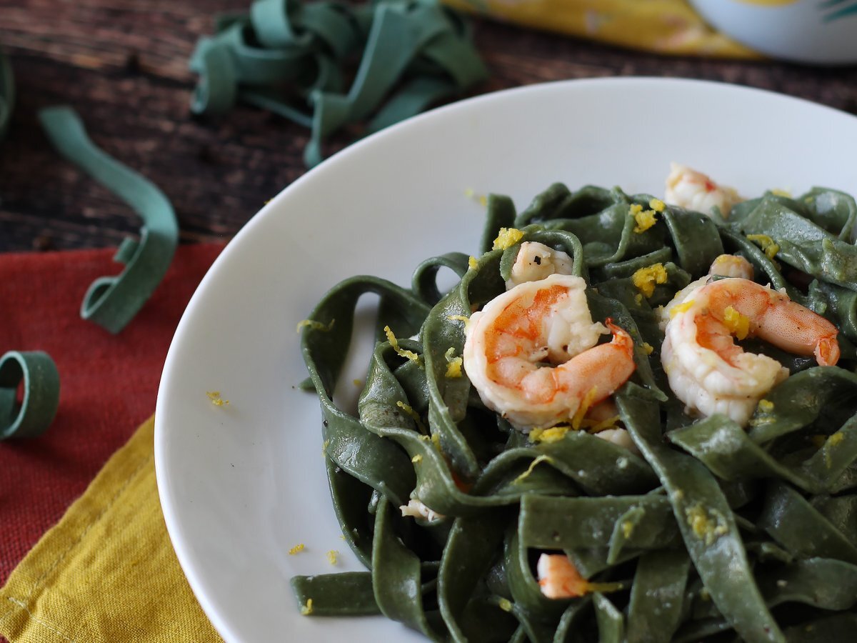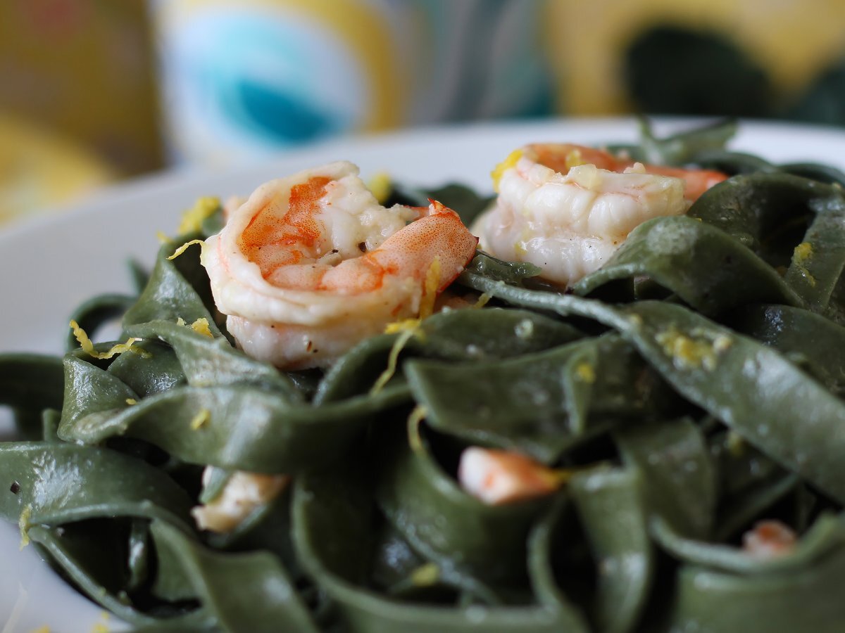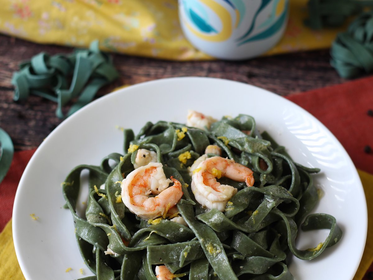 Pâtes à la spiruline, aux crevettes et au citron : un plat riche en nutriments au goût unique