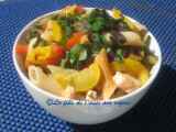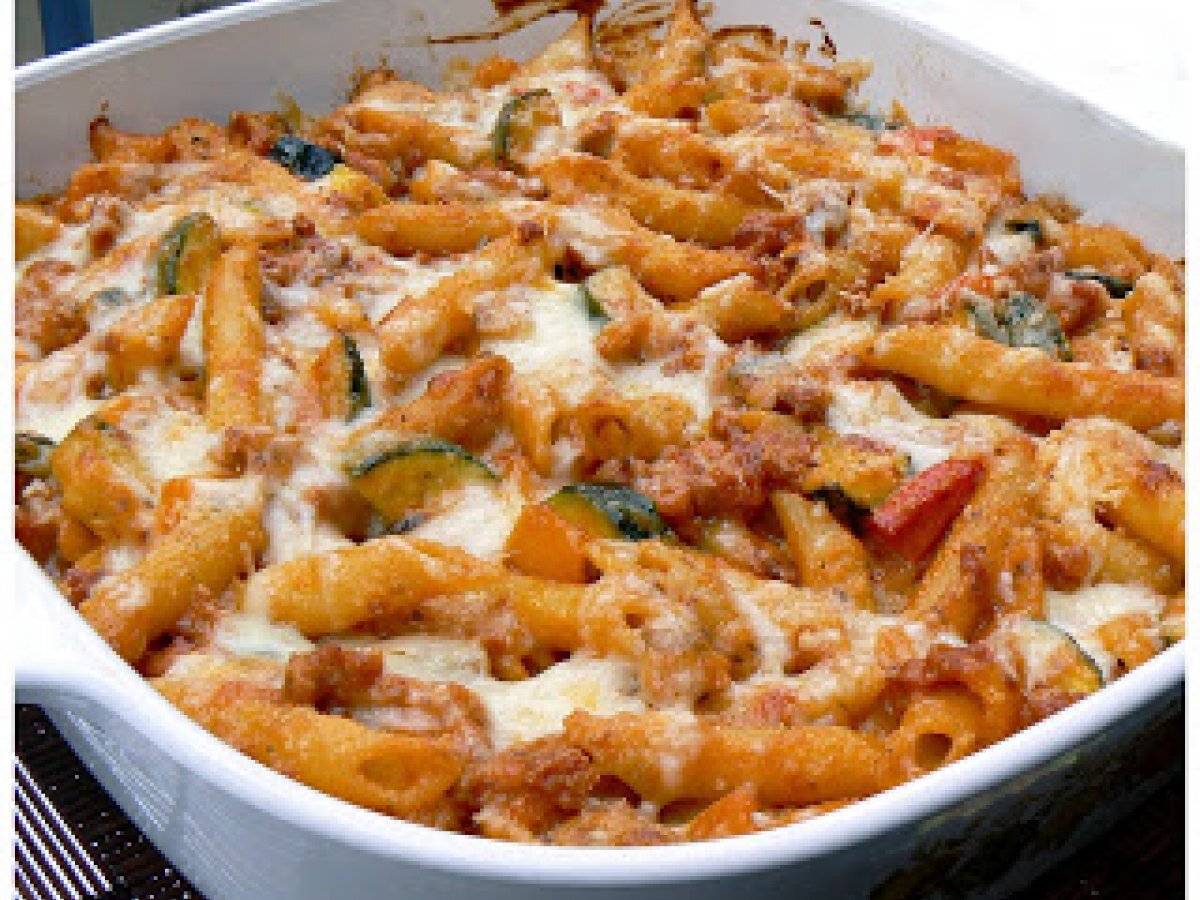 - Égouttez et remettre la saucisse dans la poêle. Ajouter la courgette, le poivron et la sauce à pizza; bien mélanger.