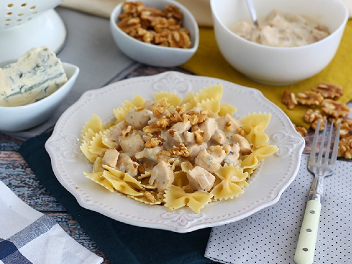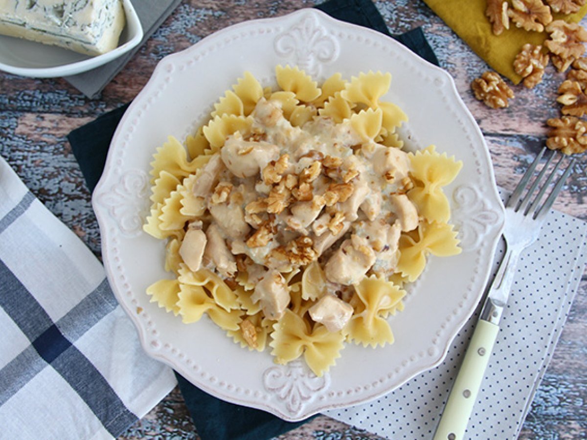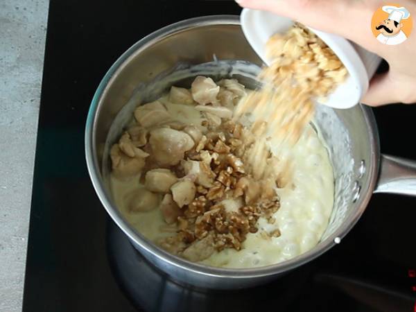 Après les 10 minutes, ajoutez le poulet et l'échalote à la sauce au gorgonzola. Ajoutez également les noix bien concassées, mélangez, et sortez du feu.