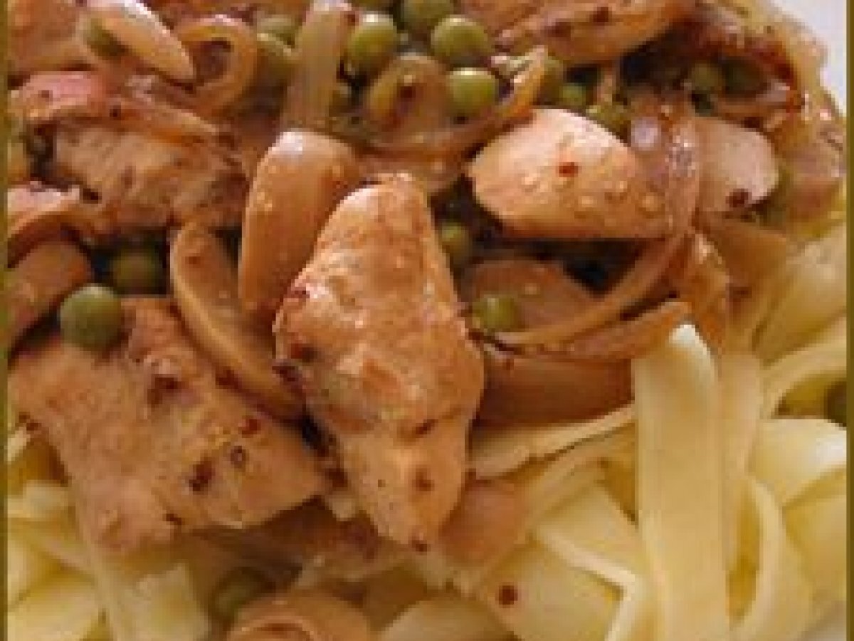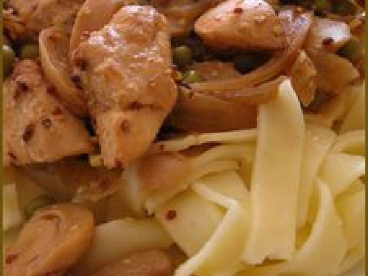 Pâtes au poulet et petits pois, sauce moutarde de sophie PrécédentSuivant Platfacile25 min Envoyer cette recette à un ami Imprimer cette page Poser une question à l'auteur Publier votre photo de cette recette Ingrédients 2 120 à 160 g de pâtes, poids cru 1 oignon 1 cuillère à soupe d'ail en poudre 125 mL de vin blanc 1 cuillère à soupe de moutarde 250 mL de crème liquide (à 3% ) 250 g de petits pois 1 petite boîte de champignons de Paris 2 escalopes de poulet 4 cuillères à soupe de ciboulette