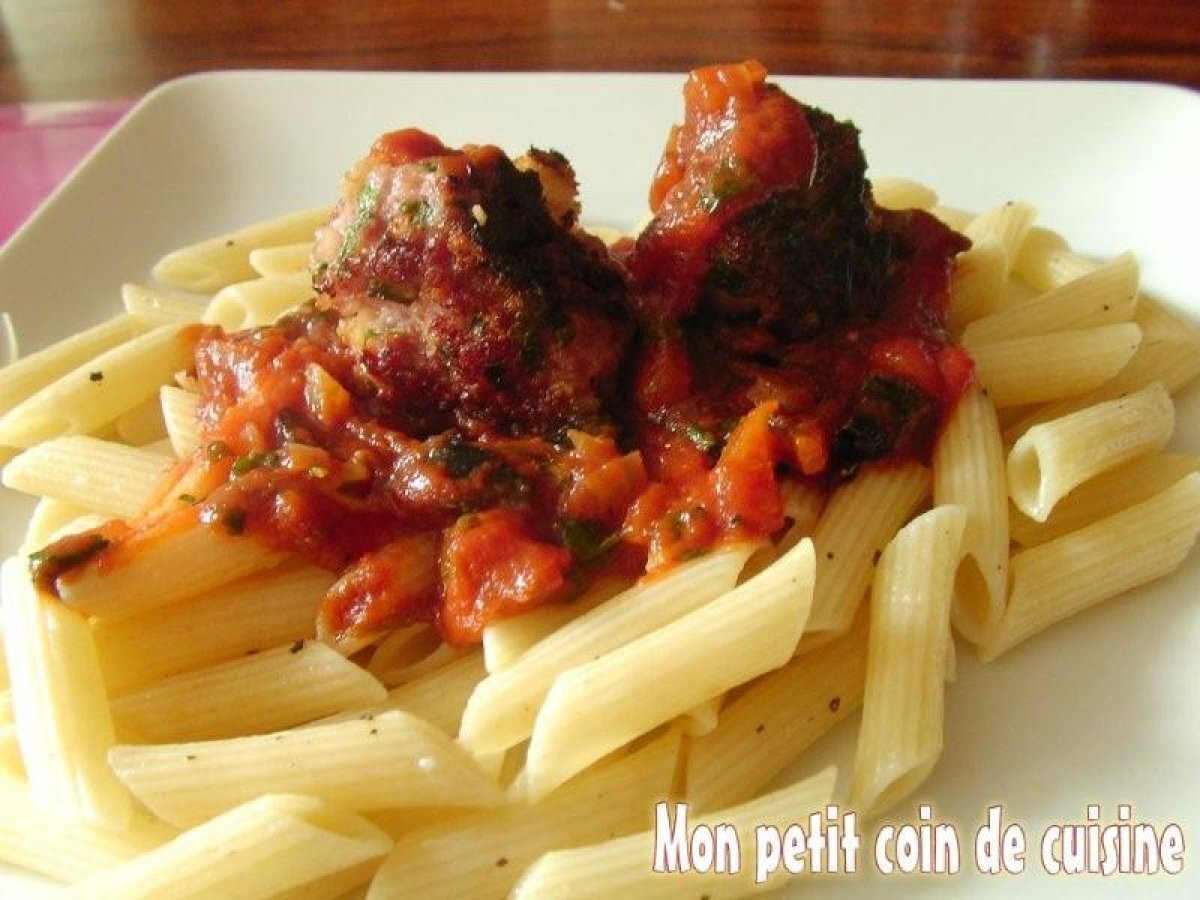 Pâtes aux boulettes et à la sauce tomate Platfacile55 min828 Kcal Envoyer cette recette à un ami Imprimer cette page Poser une question à l'auteur Publier votre photo de cette recette Ingrédients 4 400 g de chair à saucisse nature 1 tranche de pain de mie sans la croûte 1/2 bouquet de persil 1 cuillère à soupe de chapelure 4 tomates mûres 1 oignon 3 gousses d'ail 5 cuillères à soupe d'huile d'olive 1/2 bouquet de basilic ou d'origan/marjolaine/thym sel et poivre du moulin 300 g de penne 50g de tomme de brebis râpée Coût estimé: 6.96Euros€ (1.74€/part)