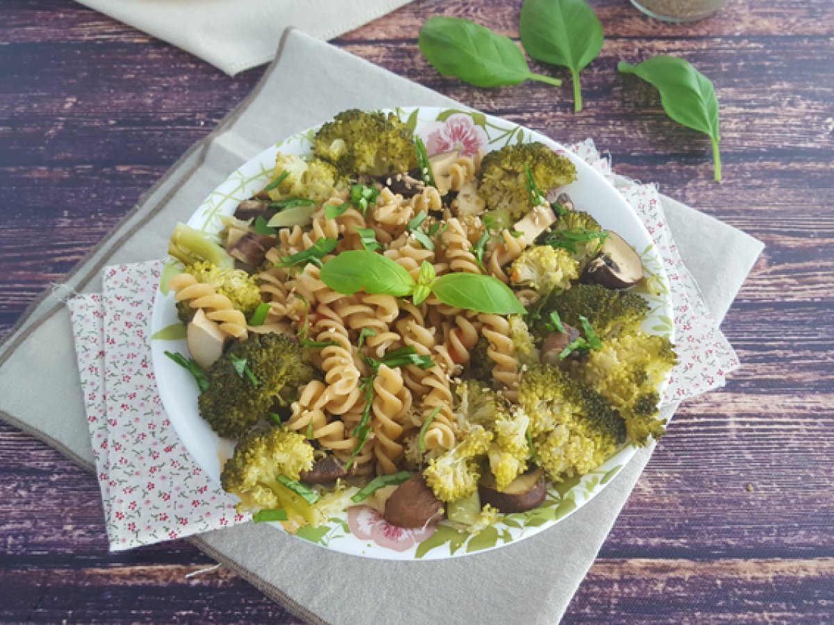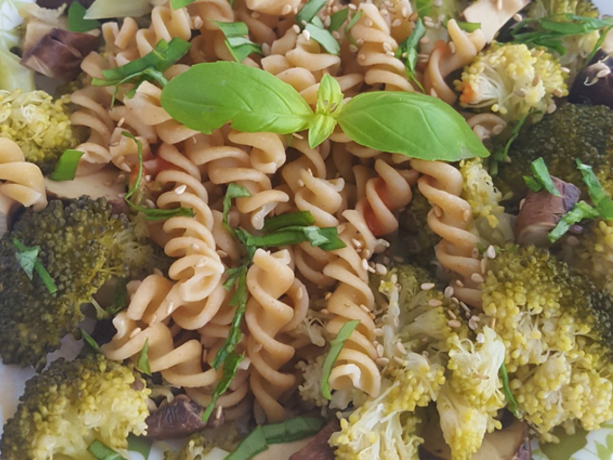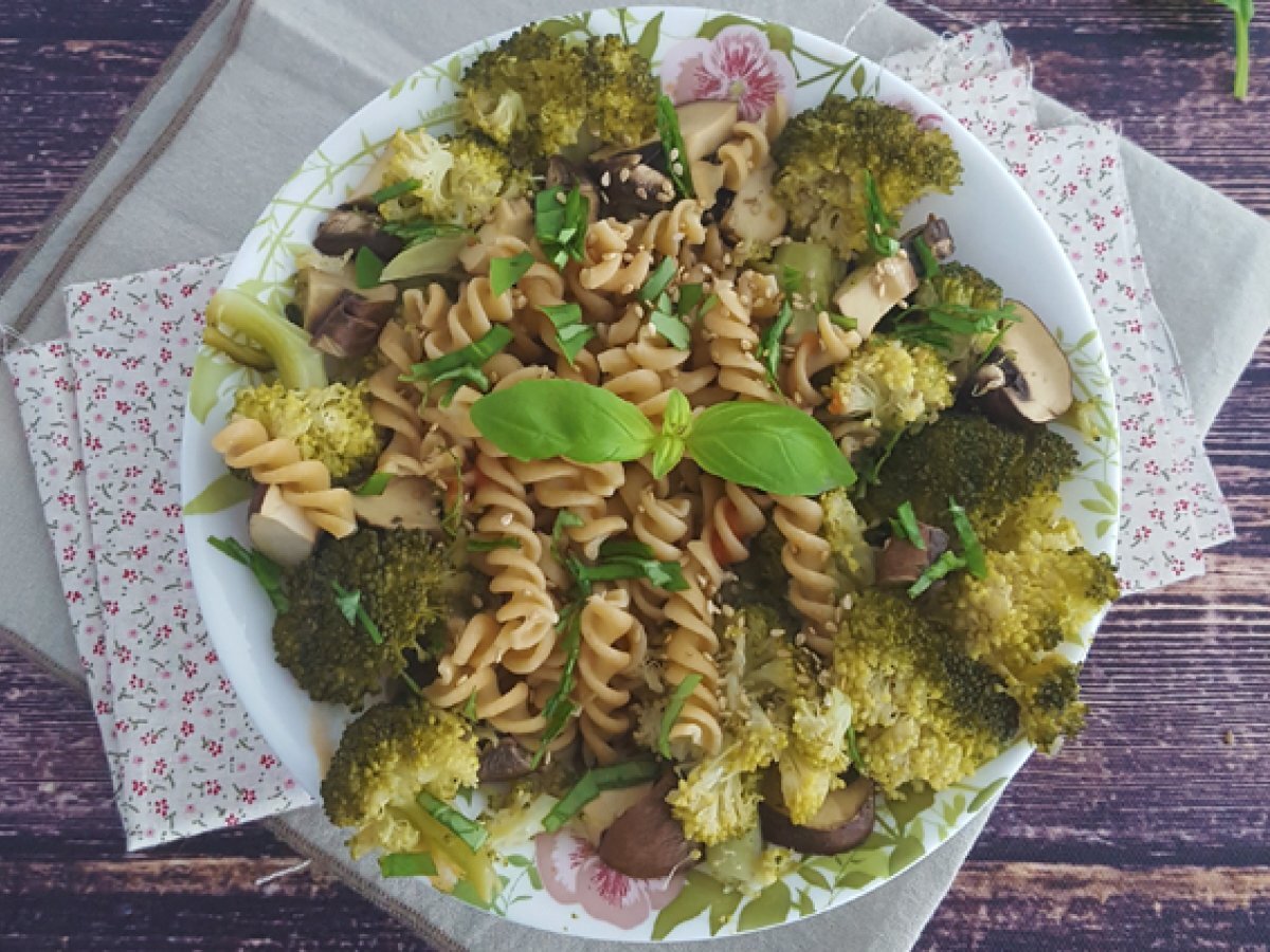 Quand on ne sait pas quoi préparer à manger mais qu'on souhaite tout de même obtenir un bon plat bien consistant et équilibré, rien de mieux que des pâtes accompagnées de légumes ! Et pour une touche de parfum en plus : le basilic bien sûr !