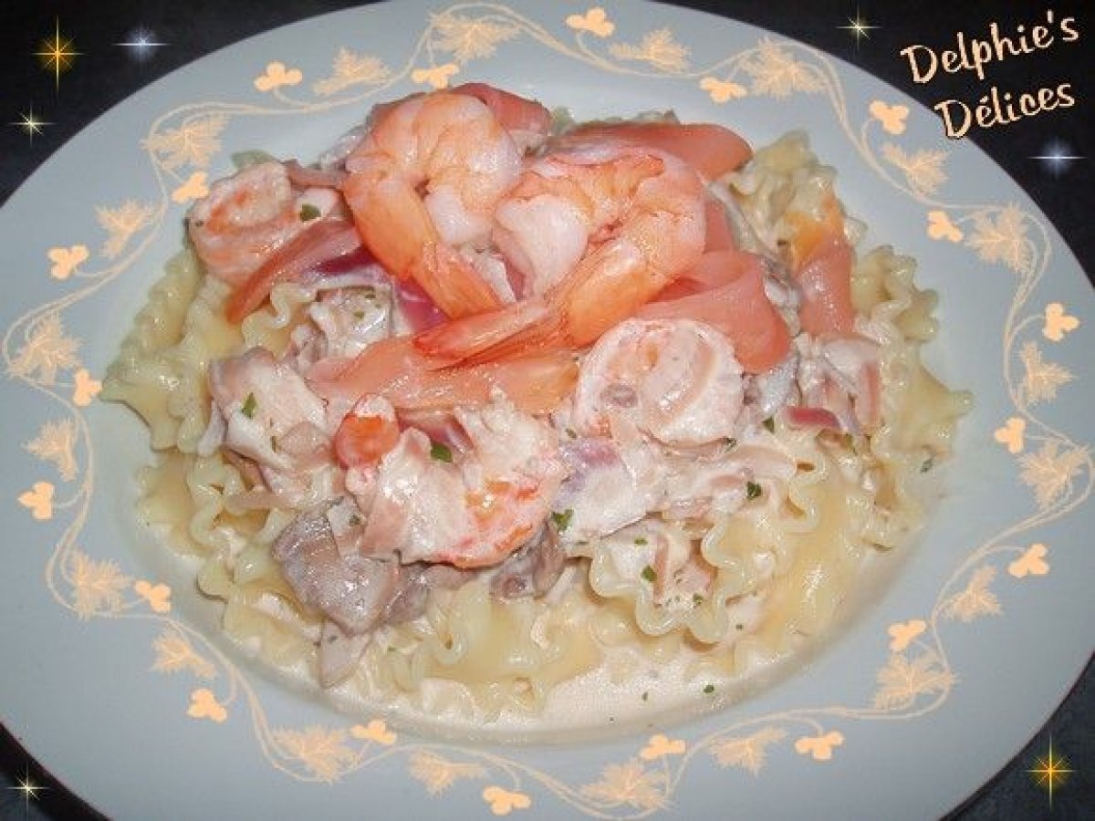 Pates aux queues de gambas et saumon fume votez maintenant Platfacile25 min1666 Kcal Envoyer cette recette à un ami Imprimer cette page Poser une question à l'auteur Publier votre photo de cette recette Ingrédients 2 250 grammes de pâtes Divella (variété Mafaldine) de chez "Toque et Calot" 1 oignon rouge émincé 150 g de champignons émincés (surgelés de Monsieur P.) 250 g de queues de gambas 50 cl de crème fraîche épaisse à 30 % 2 tranches de saumon fumé ail persil sel poivre