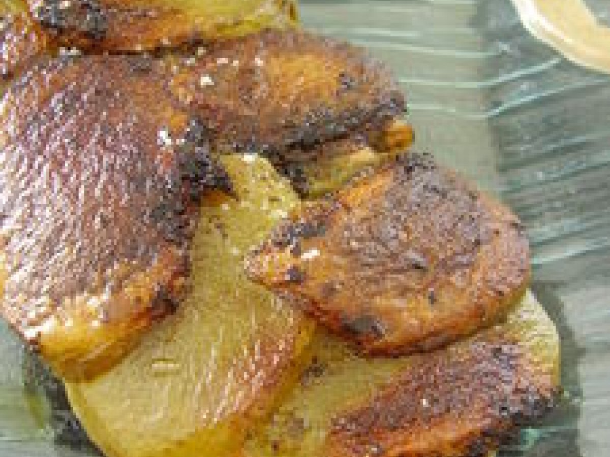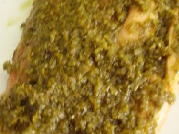 Pavé de saumon en écailles de pommes de terre à la crème de roquette.