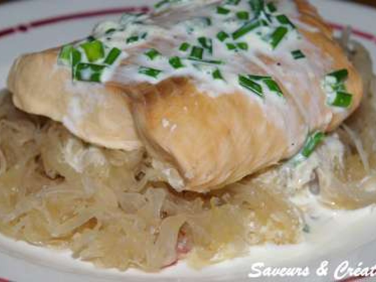 Pavé de saumon sur lit de choucroute Platfacile1 h 30 m Envoyer cette recette à un ami Imprimer cette page Poser une question à l'auteur Publier votre photo de cette recette Ingrédients 4 1 kg de choucroute crue 1 bière blonde de 25 cl 25 cl d'eau une càc de graines de coriandre une feuille de laurier sel poivre du moulin 4 pavés de saumon 10 cl de crème liquide ciboulette ciselée sel poivre du moulin citron