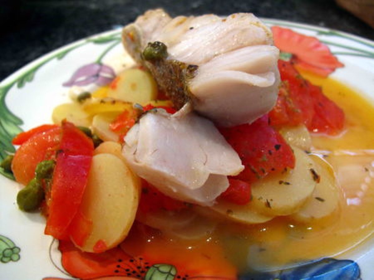 Pavés de lieu jaune, patates, tomates et câpres au barbecue votez maintenant Platfacile40 min Envoyer cette recette à un ami Imprimer cette page Poser une question à l'auteur Publier votre photo de cette recette Ingrédients 4 1 gros oignon rouge ou 2 oignons longs 1 "petit" kilo de pommes de terre nouvelles 4 grosses tomates grappe 1/2 poivron rouge 4 pavés de lieu jaune avec la peau mais sans écailles (tout pavé ou filet pas trop mince de poisson blanc conviendrait) 1 jus de citron + quelques gouttes supplémentaires pour le service 1 verre de vin blanc (Noailly-Prat) 1 petit pot de câpres au vinaigre 1 ou 2 brindilles de thym, ou 2 pincées d'herbes de Provence sel poivre huile d'olive