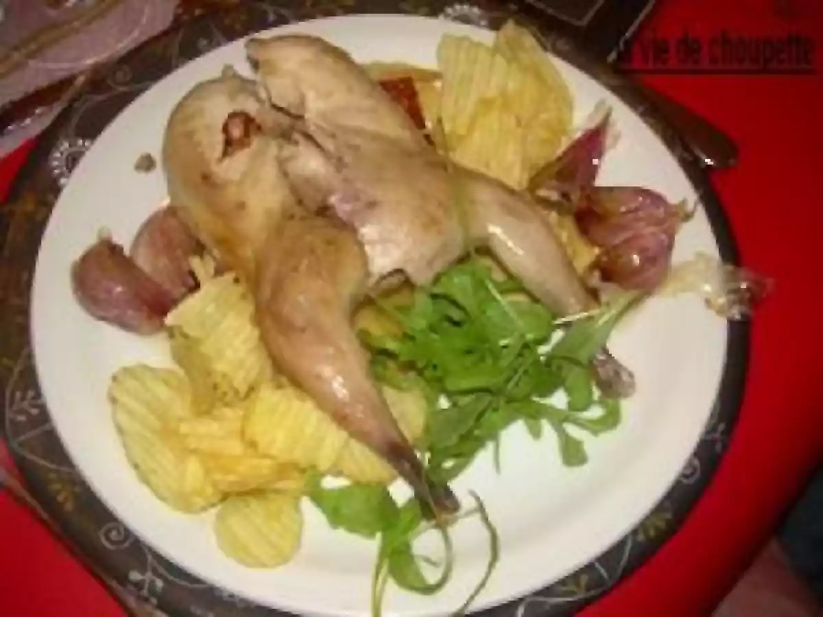 Perdreaux roti sur canape, ail en chemise votez maintenant Platfacile3 h 5 m Envoyer cette recette à un ami Imprimer cette page Poser une question à l'auteur Publier votre photo de cette recette Ingrédients 4 4 beaux perdreaux 4 morceaux de barde 1 petit pain de mie non tranché 100 g de beurre 1/4 de carotte, 1/4 d'oignon 32 gousses d'ail non épluchées 1/4 l de bouillon de volaille Sel et poivre Pour la farce : 150 g de foie gras cuit Les foies des perdreaux 80 g de barde, gras de pors 200 g de cèpes 2 cuillère à soupes de cognac 1 cuillère à soupes d'huile Pour la garniture : Pommes gaufrettes Cresson j'en ai pas trouvé, remplacé par du mesclun