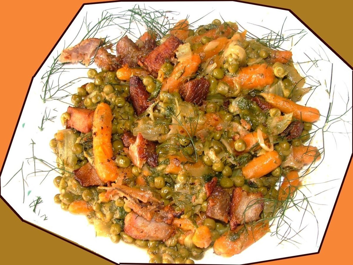 Petits pois carottes -salade à laneth (à la française modifiée) Platmoyen45 min243 Kcal Envoyer cette recette à un ami Imprimer cette page Poser une question à l'auteur Publier votre photo de cette recette Ingrédients 4 1 oignon 1 boite de petits pois carottes Sel Poivre Epices dHildegarde ½ verre de Vin Blanc Aneth (1 grosse poignée) Huile dolive (1 cuillère moyenne) 1 petite cuillère de margarine Fruit dor légère 25%mg 1 cuillère de fond de viande Magie Graines danis 1 tête de salade verte 2 cuillères de crème liquide semi-épaisse 30%mg Lardons ou lard Coût estimé: 6.52Euros€ (1.63€/part)