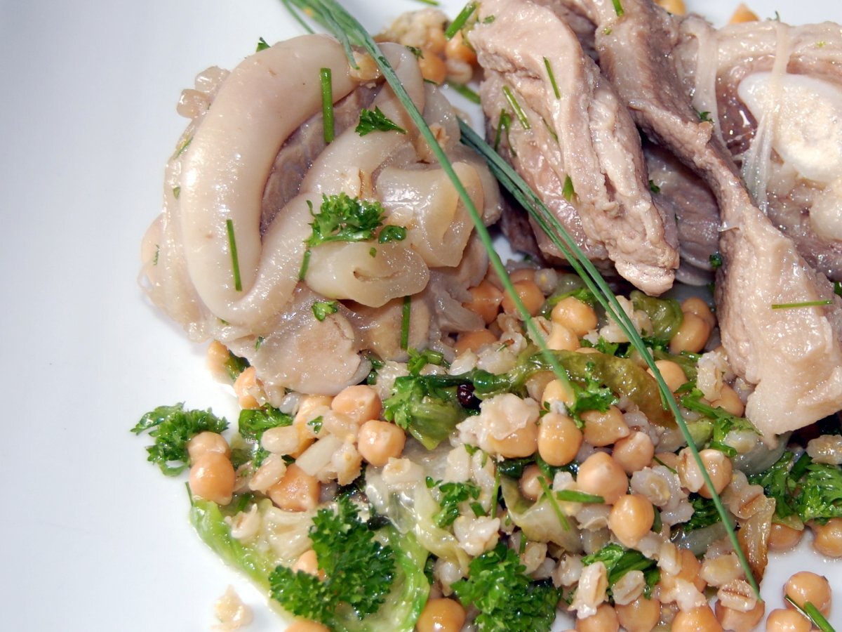 Pied et blanquette de veau aux pois chiches et à l'orge.