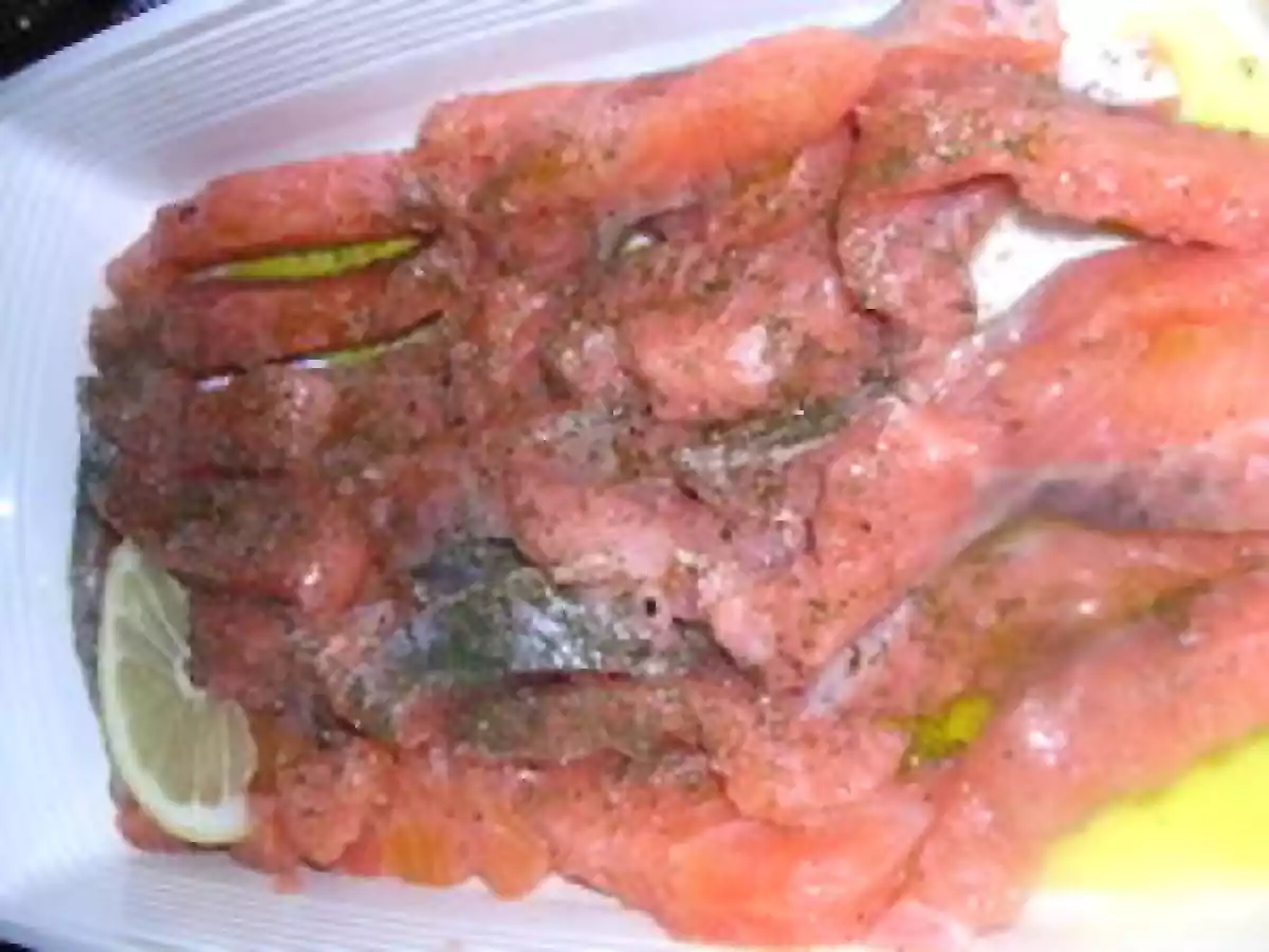 - Coupez le filet de saumon en fines tranches,et les déposez dans un plat creux.