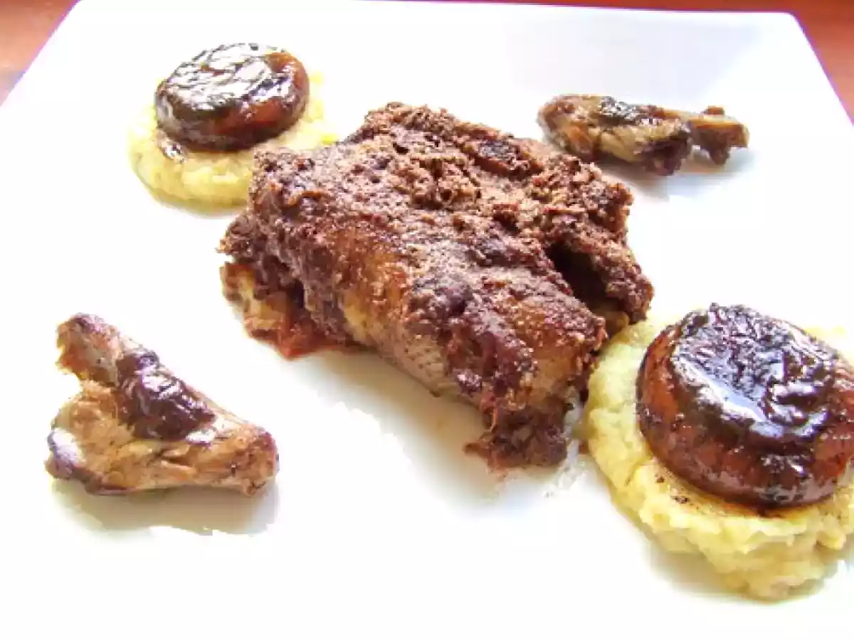 Pigeonneau farci en croûte de cacao, figues confites & sauce chocolatée