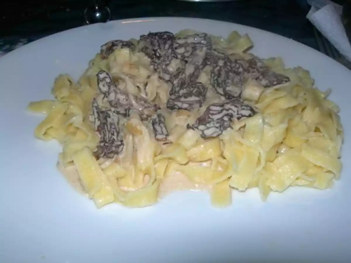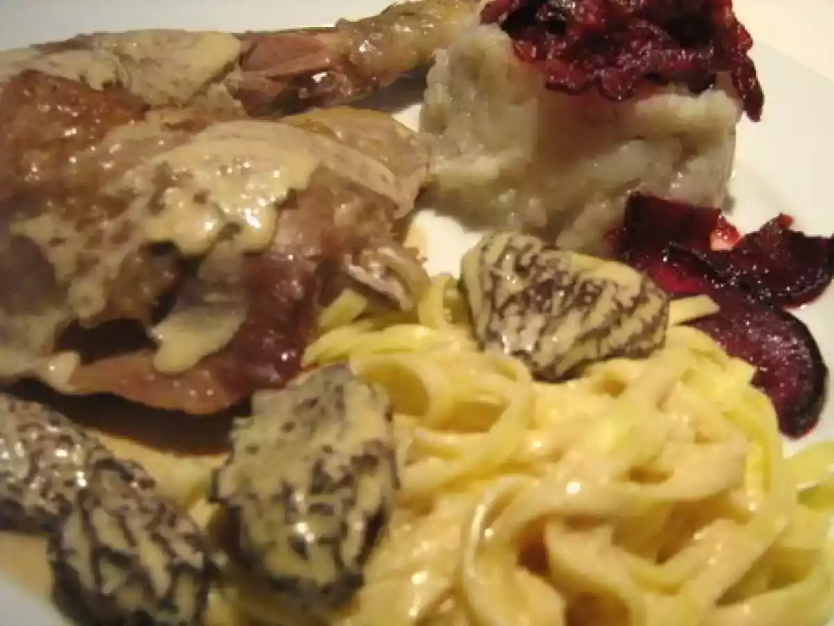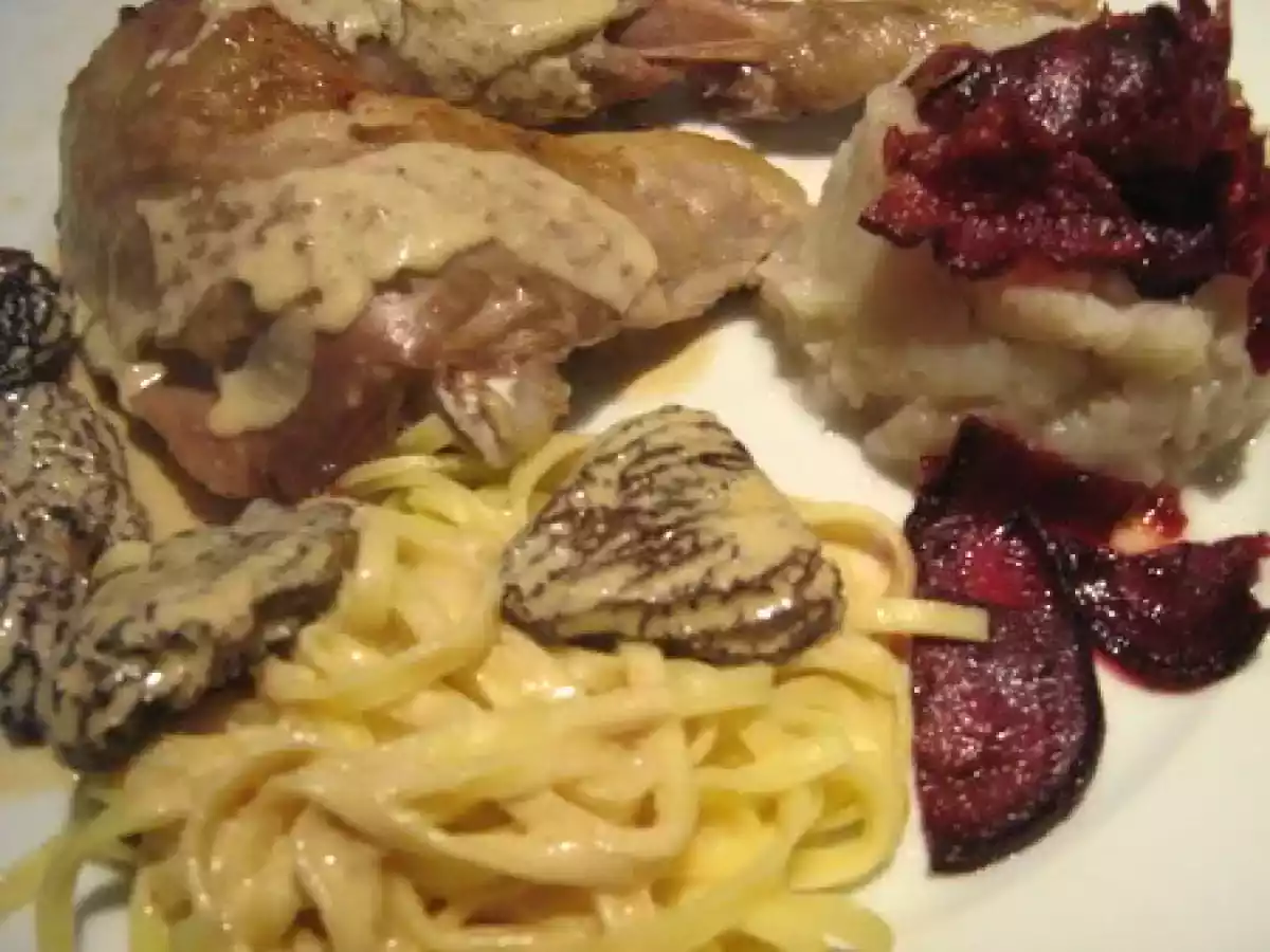 Un beau plat très appétissant. Le vin jaune à l'arôme très caractéristique de noix et qui se marie bien avec les morilles.