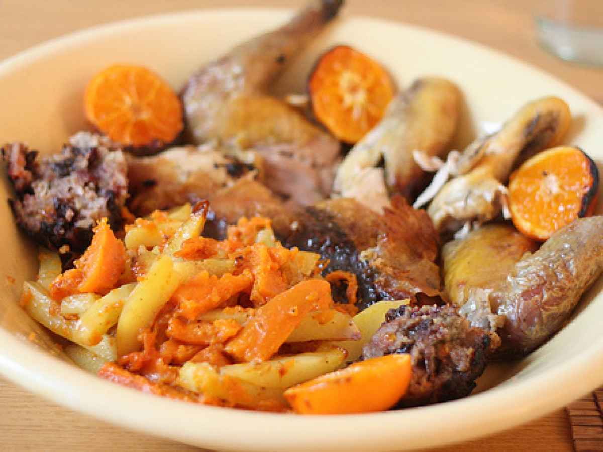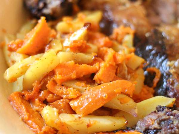 Faire cuire à couvert sur feu moyen pendant 20 minutes. - Écraser le tout avec une fourchette ou un presse-purée en ajoutant le beurre. Réserver au chaud jusqu'au moment de servir puis décorer de quelques brisures de marrons.