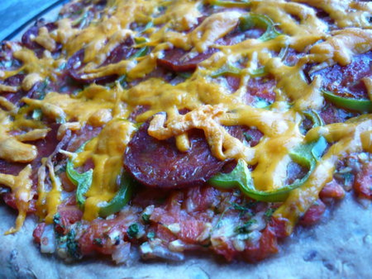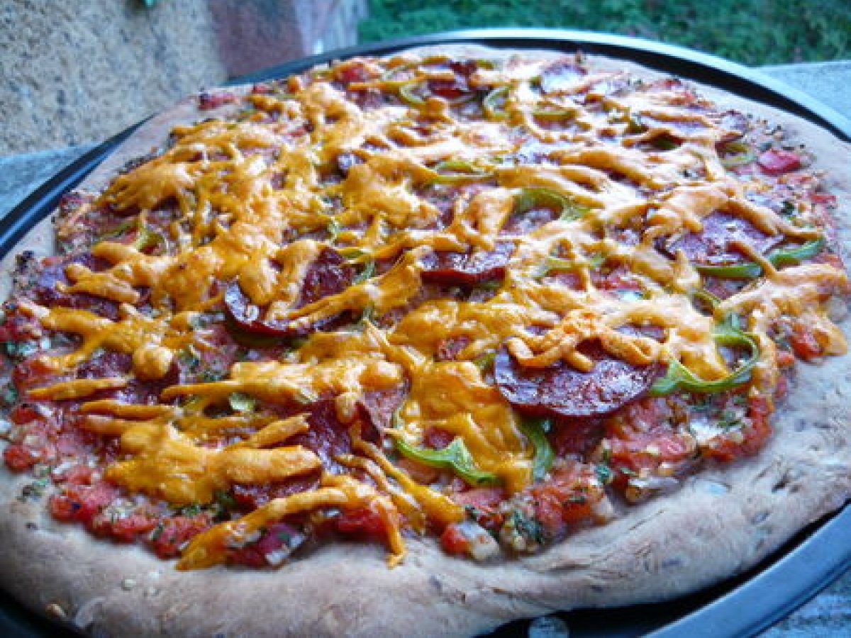 Pizza à la salade de tomates et coriandre PrécédentSuivant Platfacile30 min894 Kcal Envoyer cette recette à un ami Imprimer cette page Poser une question à l'auteur Publier votre photo de cette recette Ingrédients 4 Pour la pâte à pizza : 500 g de farine aux céréales 1 sachet de levure à pain 1/2 cuillère à café de sel 5 cl d'huile d'olive 25 cl d'eau tiède Pour la garniture : 5 tomates pelées et épépinées 1 gros oignon blanc ou 2 à 3 petits 1/2 bouquet de coriandre hachée 1 gousse d'ail écrasée 1 cuillère à soupe d'huile d'olive 1 cuillère à café de vinaigre balsamique chorizo en tranches poivron vert en fines lamelles mimolette