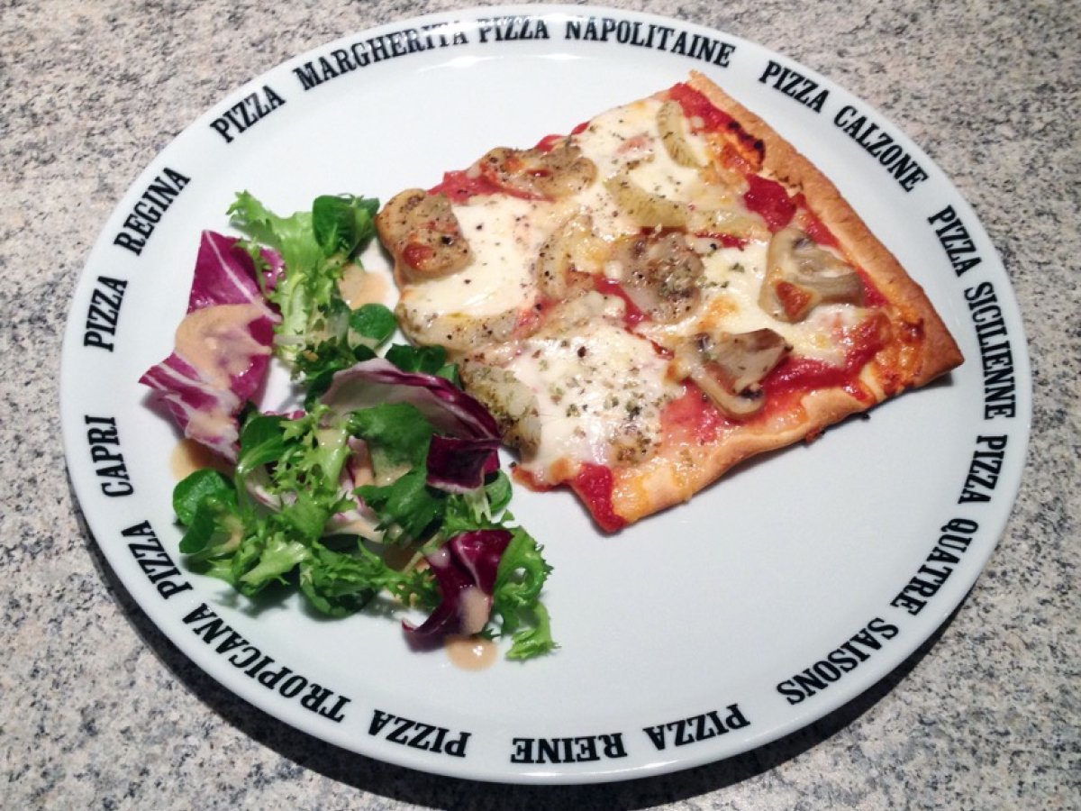 J’ai essayé de changer un peu des classiques jambon, fromage etc, et opté pour un légume qu’on ne trouve pas souvent dans les pizzas : l’artichaut (ou plus exactement le fond).