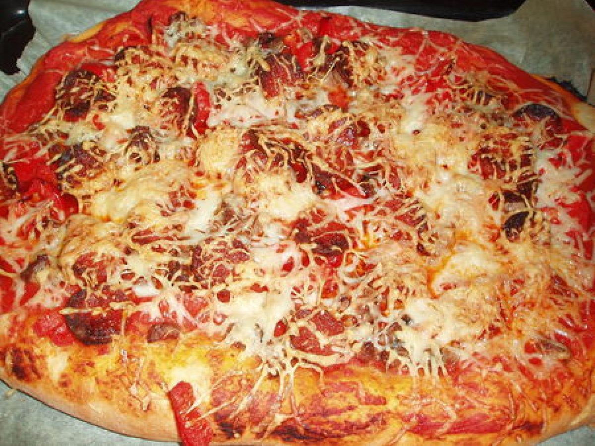 Pizza au boeuf pimenté et chorizo votez maintenant Platfacile32 min Envoyer cette recette à un ami Imprimer cette page Poser une question à l'auteur Publier votre photo de cette recette Ingrédients 4 Pour la pâte : 210 ml d'eau 20 ml d'huile d'olive 1 cuillère à café de sel 1 cuillère à café de sucre 360 g de farine t 55 1 cuillère à café de levure déshydratée Pour la garniture : du coulis de tomate 100 g de chorizo en rondelles 1 steak boeuf charolais 1 cuillère à café de piment de Nioras de la Safranière de Lorraine 2 poivrons rouges du gruyère râpé du sel