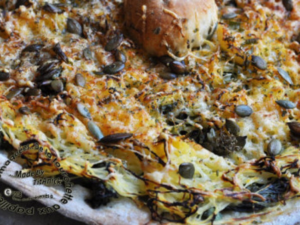 Pizza aux oignons, vert de poireaux, épinards et courge spaghetti votez maintenant Platfacile25 min Envoyer cette recette à un ami Imprimer cette page Poser une question à l'auteur Publier votre photo de cette recette Ingrédients 4 250-300 g de pâte à pizza 1 petite courge spaghetti I poignée de vert de poireau 1 petit oignon 250 g d'épinards 150 g d'emmental râpé 100 g de parmesan 20 feuille de verveine (facultatif) 1 poignée de graines de courges Huile d'olive Sel poivre