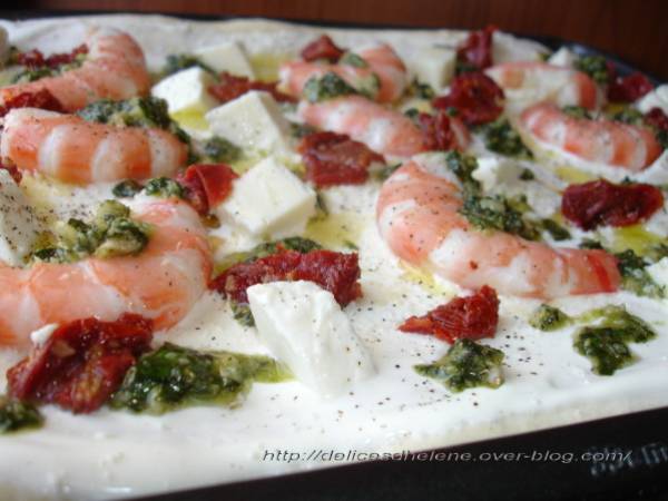 Pizza crevettes, tomates confites et pesto