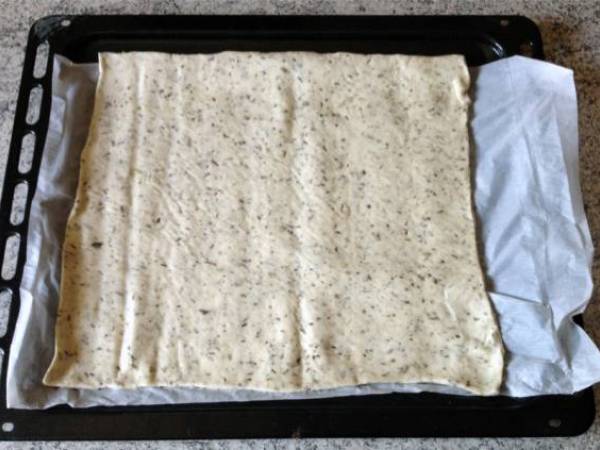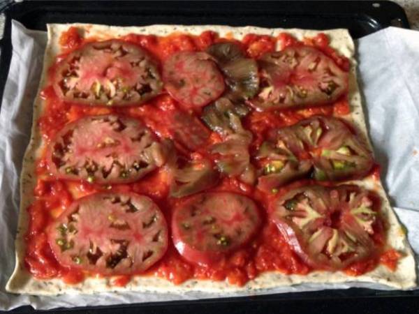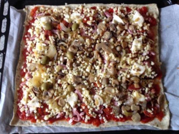 Voici une pizza pour laquelle on s’est un peu lâchés sur la garniture ! Au départ, faute de temps on voulait en acheter une toute faite, mais une fois dans le magasin, on a trouvé les pizzas dans les rayons un peu « légères »… 3 lardons qui se battent en duel avec une poignée de fromage : non merci ! On a donc opté pour une pâte toute prête avec une garniture maison et ça a été pour nous l’occasion de découvrir une délicieuse pâte à pizza de chez E. Leclerc : la pâte à pizza moelleuse aux herbes de Prove