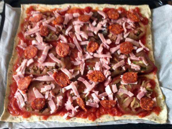 Pizza jambon, chorizo, champignons, fromage, tomate