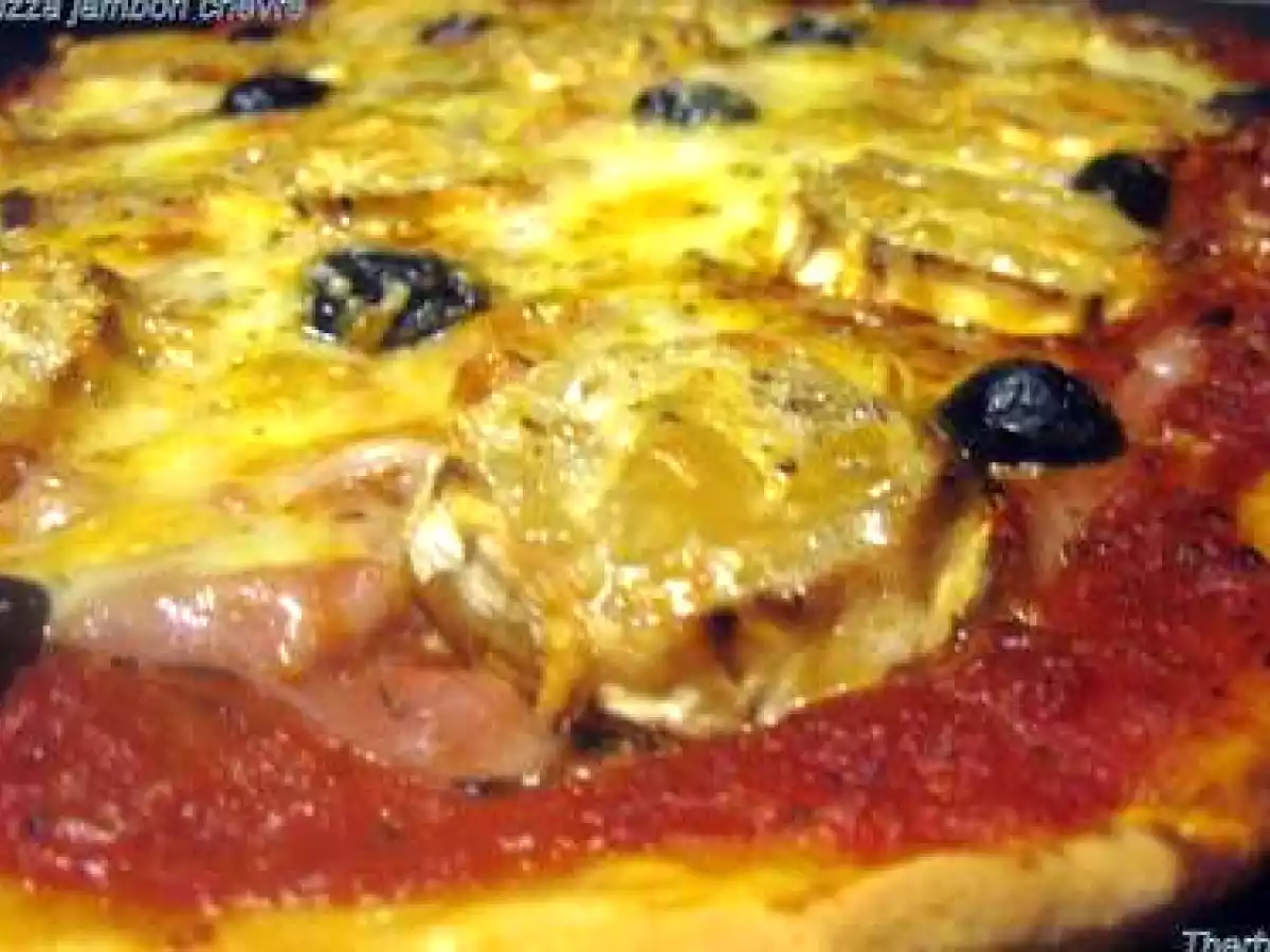 Pizza pâte fine jambon chèvre Platmoyen45 min Envoyer cette recette à un ami Imprimer cette page Poser une question à l'auteur Publier votre photo de cette recette Ingrédients 6 Pour 2 pizzas fines (1 grande rectangulaire et 1 ronde) : 350 g de farine T55 200 ml d'eau 7 g de levure instantanée (ou 20 g de levure fraîche) 1 càc de sel 2 càs d'huile d'olive Garniture : une boite de sauce tomate "pizzassimo" tranches fines de jambon aux herbes 1 buche de chèvre mozzarella gruyère râpé olives noires herbes à pizza