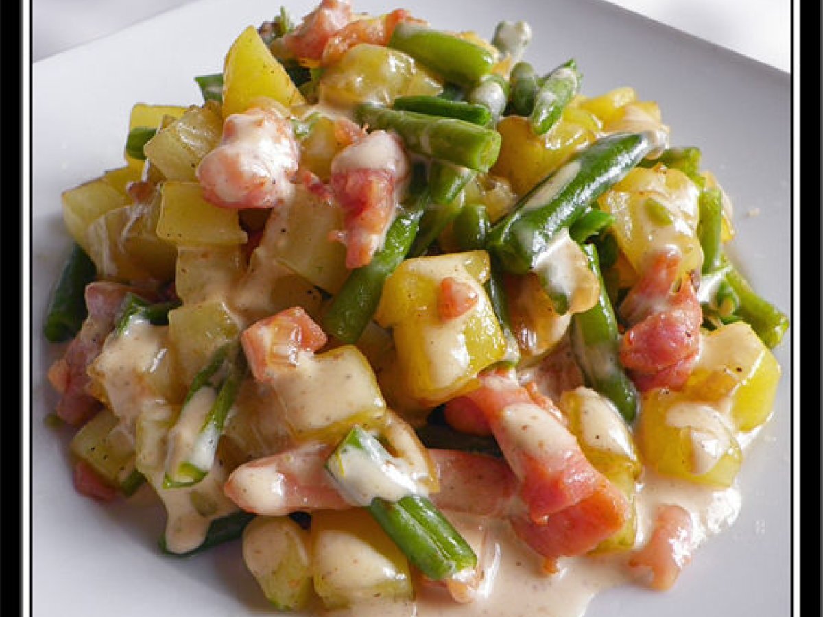 - Quand les patates sont cuites, y incorporer les haricots verts coupés en morceaux, les lardons de poulet et l'oignon.
