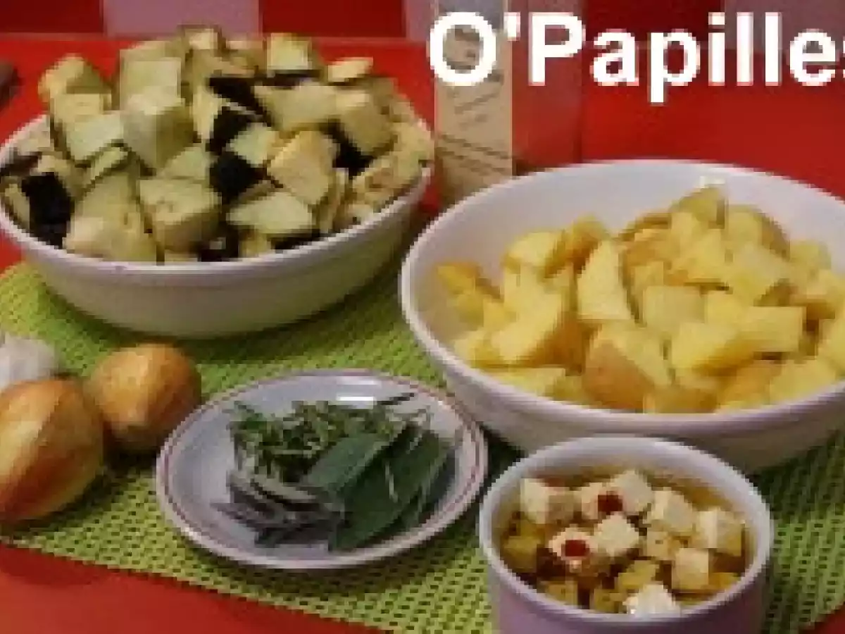 Poêlée d'aubergines et pommes de terre nouvelles ditta PrécédentSuivant Platfacile50 min498 Kcal Envoyer cette recette à un ami Imprimer cette page Poser une question à l'auteur Publier votre photo de cette recette Ingrédients 4 4 aubergines 6 pommes de terre 2 oignons 3 gousses d'ail quelques feuilles de sauge des brins de romarin 2 cuillères à soupe d'huile de tournesol des cubes de feta à l'huile sel poivre Coût estimé: 8.57Euros€ (2.14€/part)