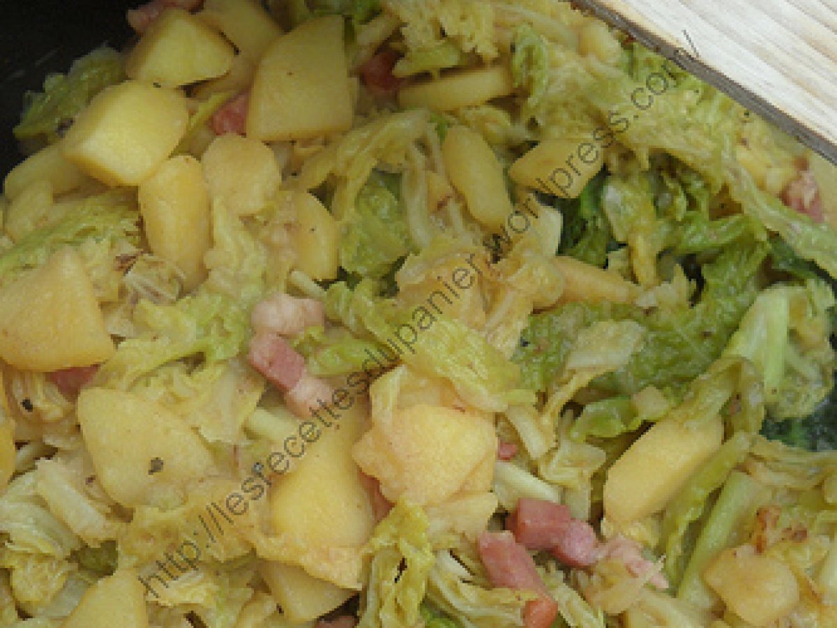Poêlée de chou vert, pommes de terre et cantal Platfacile18 min380 Kcal Envoyer cette recette à un ami Imprimer cette page Poser une question à l'auteur Publier votre photo de cette recette Ingrédients 6 1 chou de milan 1 kg de pommes de terre 200 g de lardons 100 g de cantal râpé 200 ml de bouillon de volaille sel poivre huile d’olive