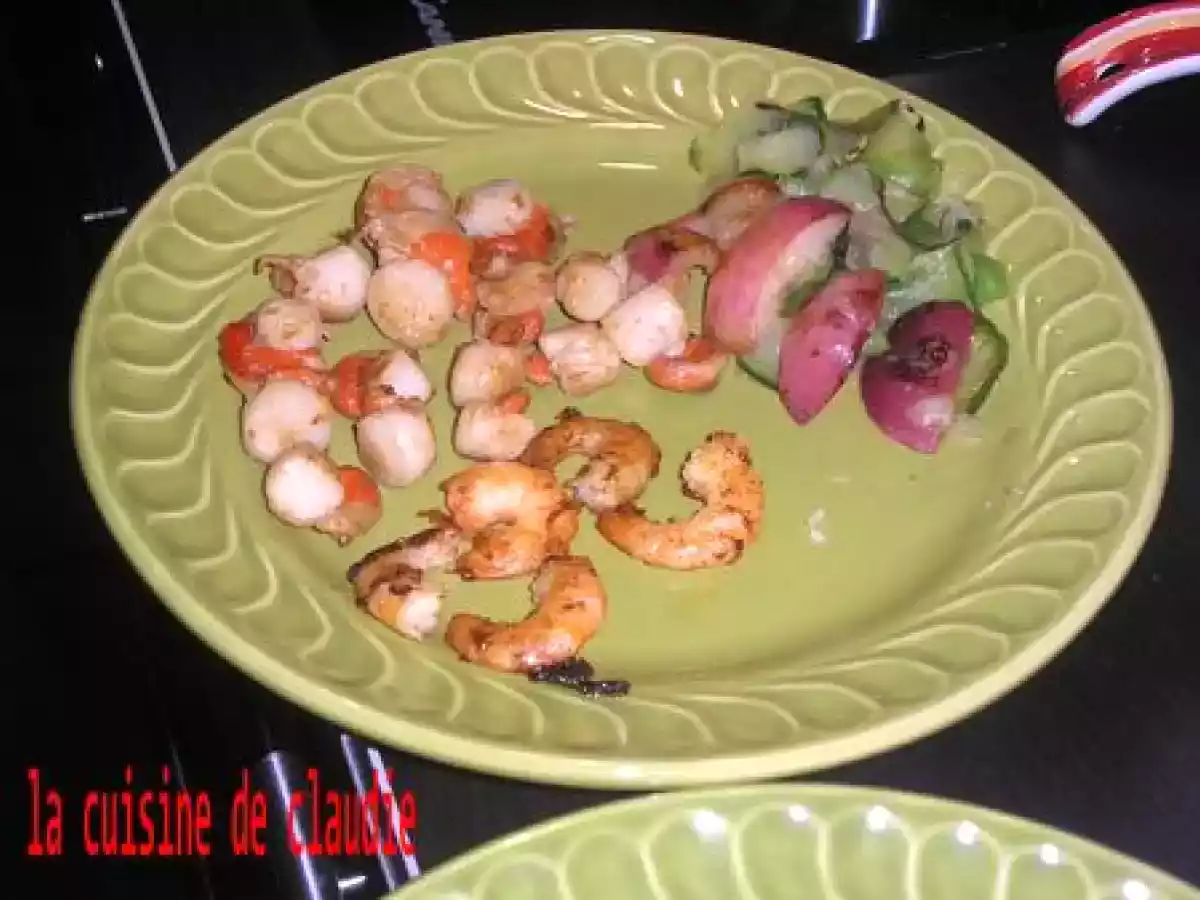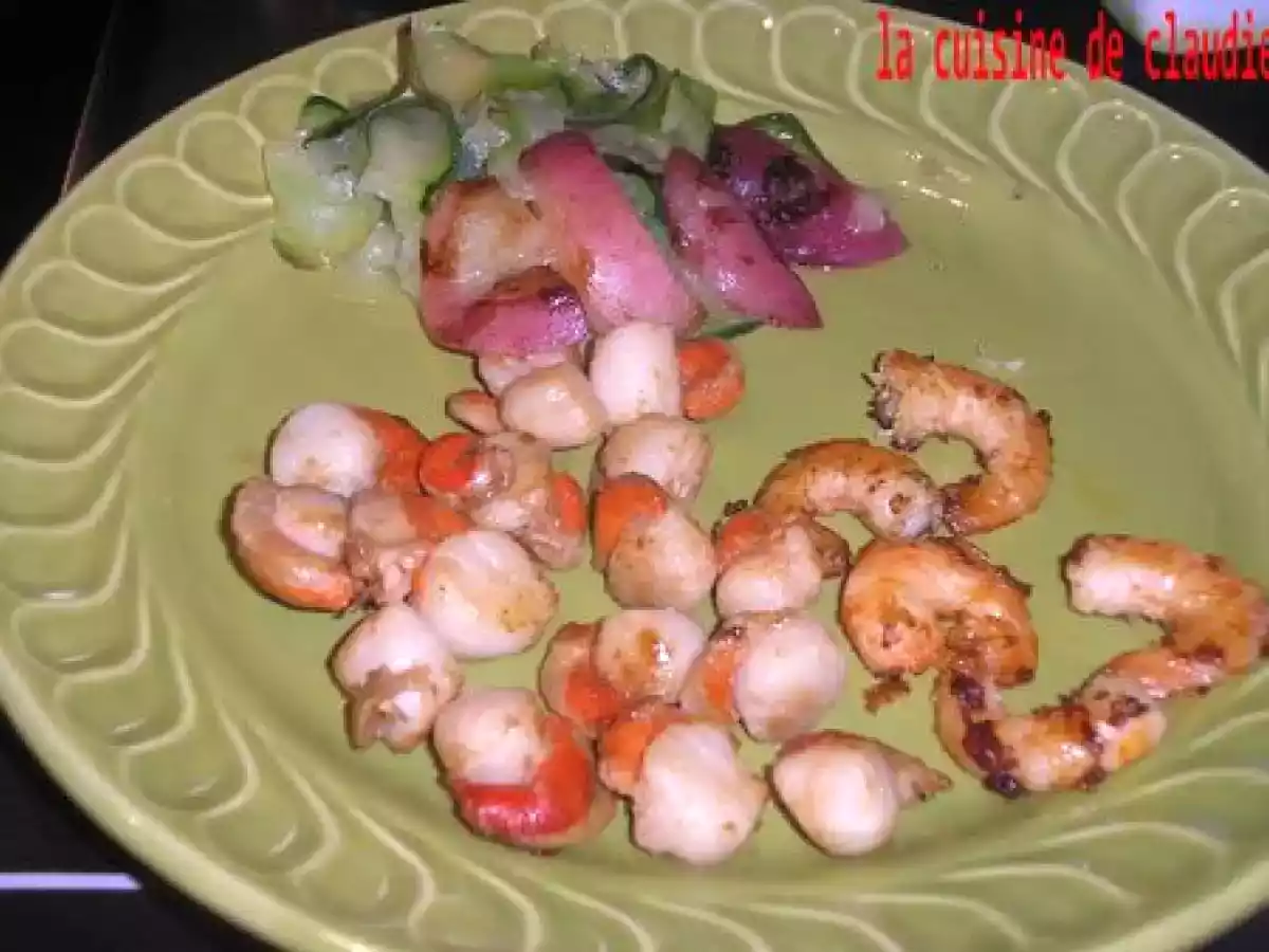 Poêlée de crevettes et saint jacques aux pêches PrécédentSuivant Platmoyen15 min467 Kcal Envoyer cette recette à un ami Imprimer cette page Poser une question à l'auteur Publier votre photo de cette recette Ingrédients 2 300 g de saint jacques 10 crevettes 1 courgette 1 pêche 3 cuillères à soupe d'huile d'olive sel herbe de provence Coût estimé: 17.26Euros€ (8.63€/part)