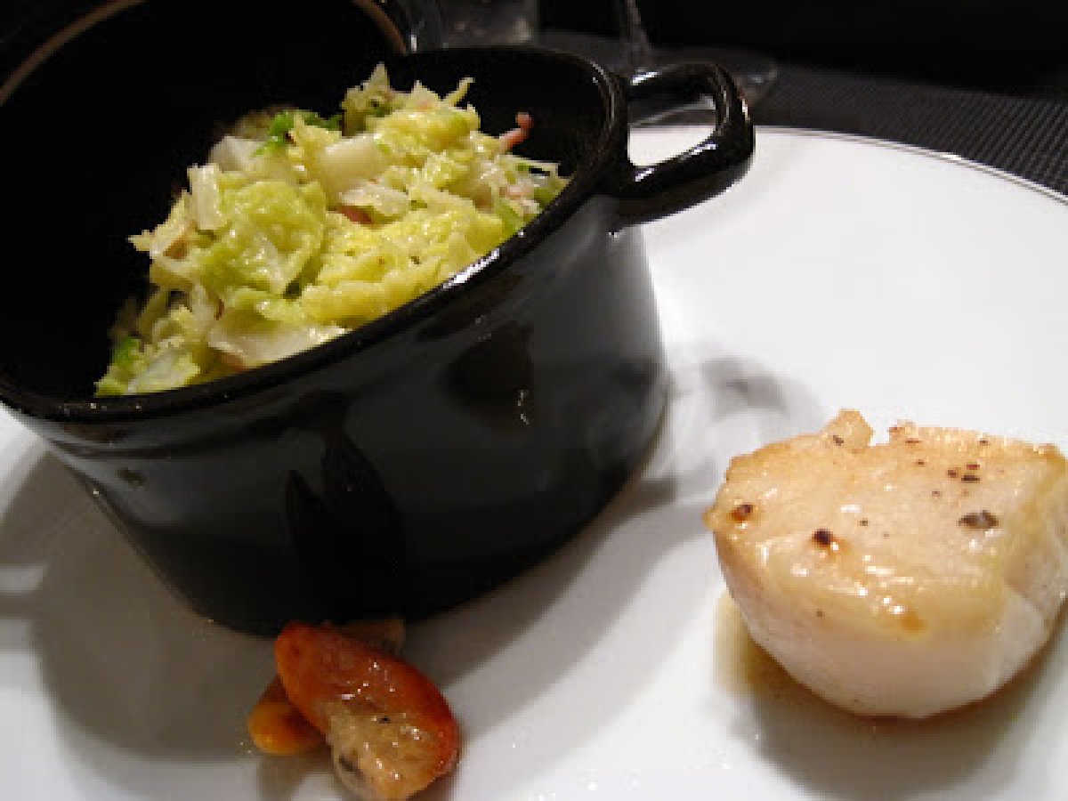 Poêlée de saint-jacques, embeurrée de choux