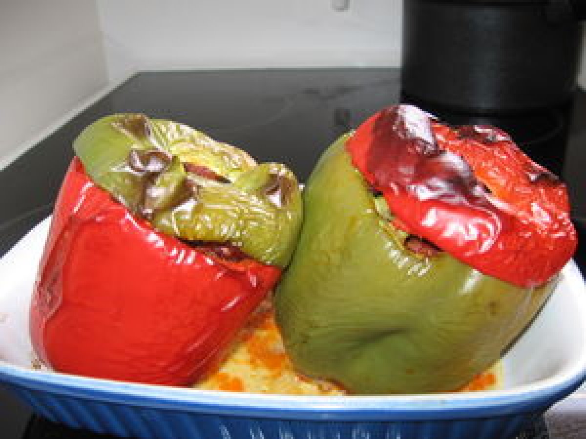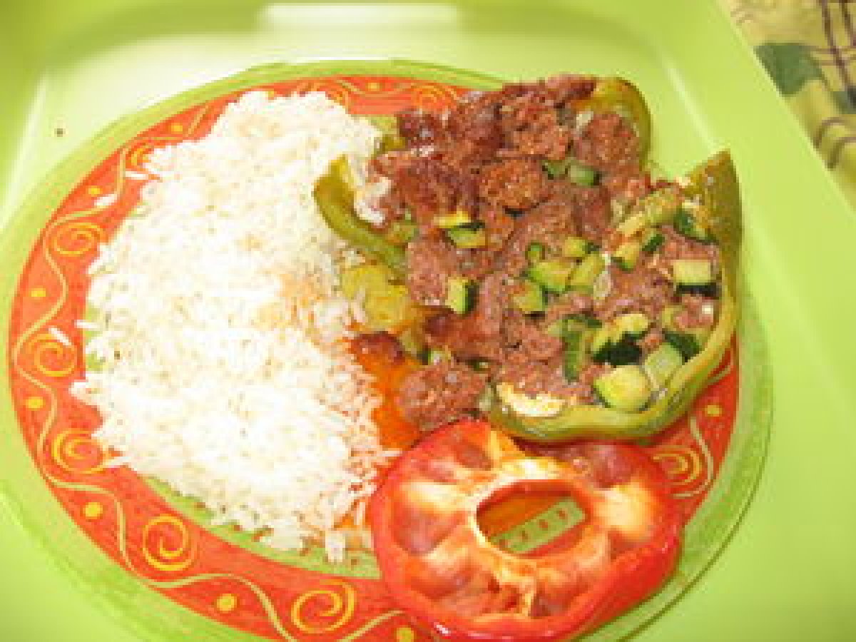 Délicieux avec du riz et une sauce tomate pour accompagner ce magnifique poivron farcis à la courgette et merguez.