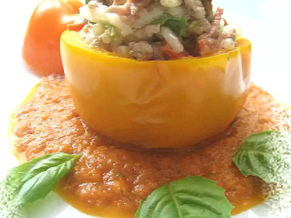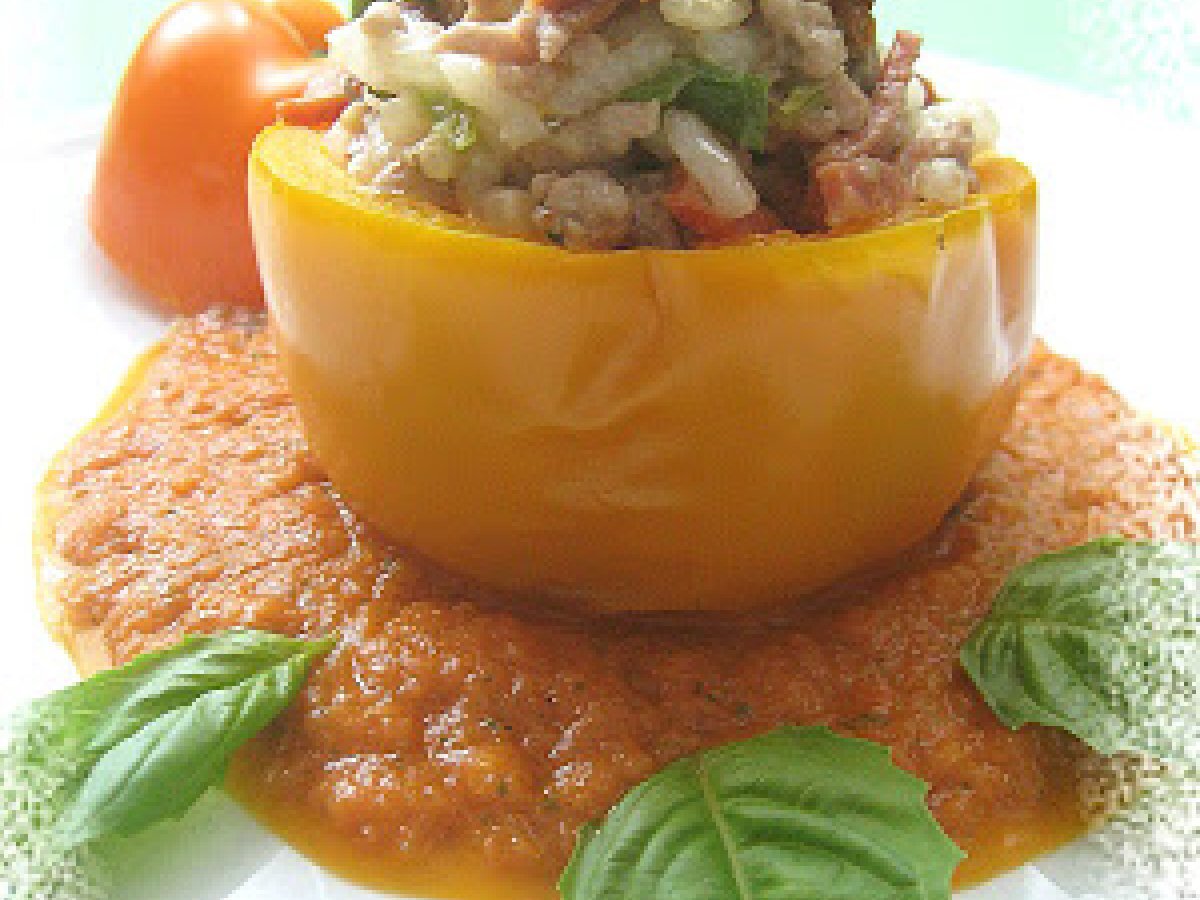 Poivrons grillés farcis, sauce tomate votez maintenant Platfacile2 h 25 m Envoyer cette recette à un ami Imprimer cette page Poser une question à l'auteur Publier votre photo de cette recette Ingrédients 6 6 gros poivrons Huile d'olive, pour huiler les poivrons 1/2 tasse(125 ml)de riz italien pour risotto Eau, en quantité suffisante Sel, au goût 3 cuillères à soupe(45 ml)d'huile d'olive 1/2 lb(250 g)de veau haché 1/2 lb(250 g)de porc haché 1/2 saucisson sec de type pepperoni, coupé en petits dés 2 oignons verts émincés 2 gousses d'ail hachées 1/3 tasse(80 ml)de tomates séchées 3/4 tasse(180 ml)de champignons émincés Le zeste de 1 orange(facultatif) 1/3 tasse(80 ml)de parmesan râpé Sel et poivre, au goût Sauce tomate: 6 grosses tomates, le pédoncule retiré et coupées en quartiers 1/2 oignon rouge coupé en quartiers 2 gousses d'ail coupées en deux 5 feuilles de basilic, frais 1 cuillère à thé(5 ml)d'origan Sel et poivre au goût 3 cuillères à soupe(45 ml)d'huile d'olive