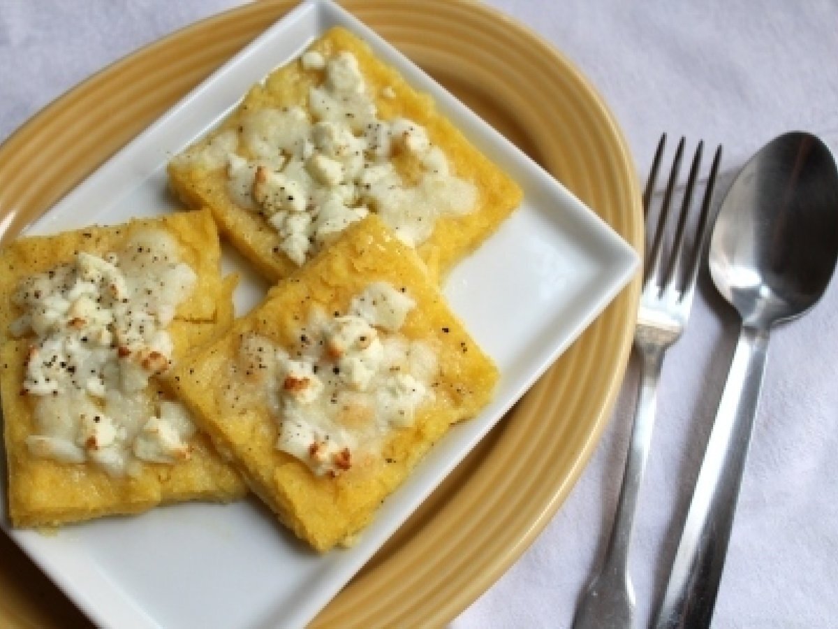 Des petits pavés de polenta et une couche de mozzarella et de feta gratinée au four