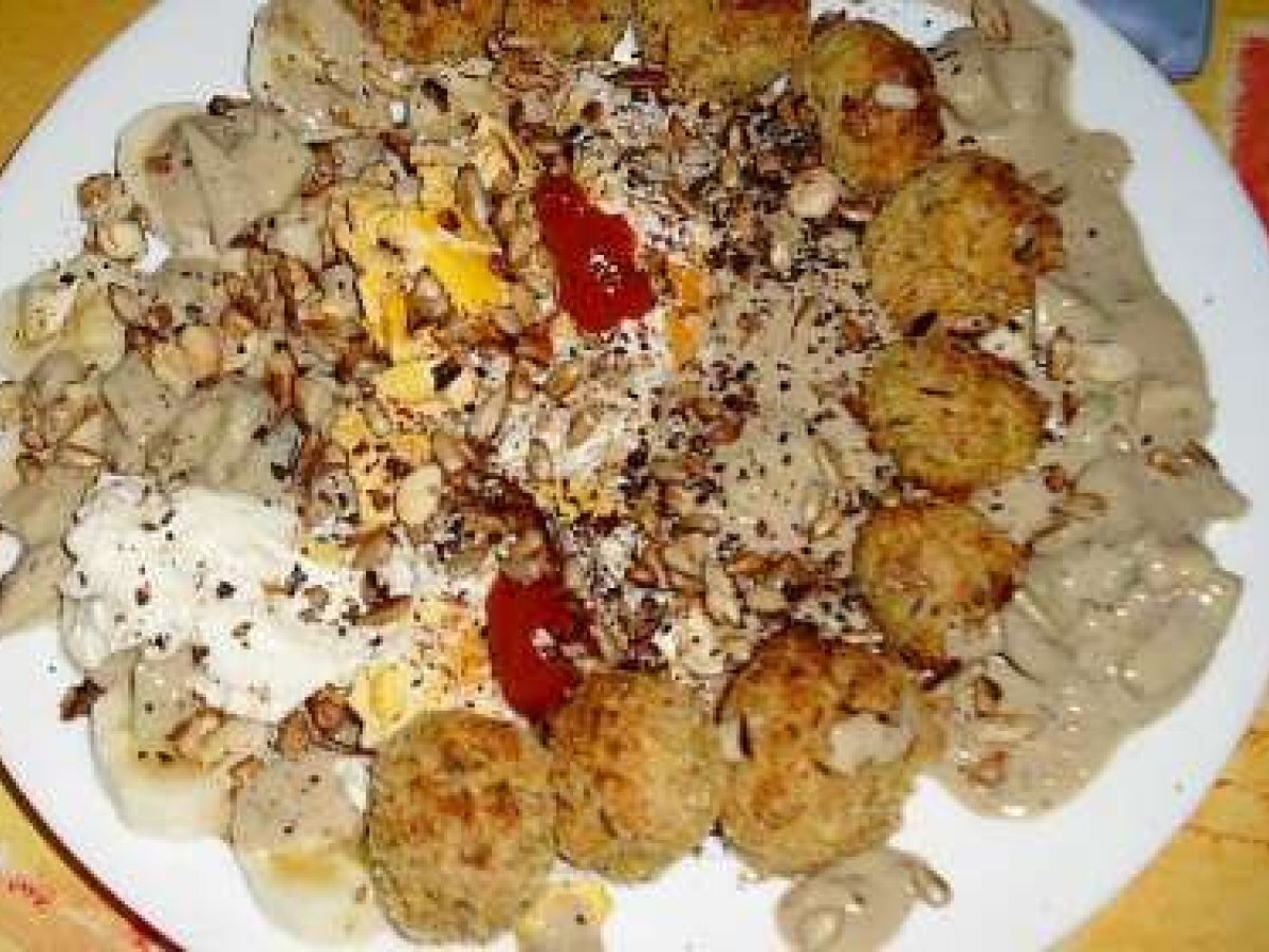 pommes dauphines persillées aux oeufs aladin et crème avocat Platmoyen1 h 10 m Envoyer cette recette à un ami Imprimer cette page Poser une question à l'auteur Publier votre photo de cette recette Ingrédients 4 4 grosses patates Persil, Ail Sel et poivre Curcuma Beurre salé 2 crackers au maïs 1 crackers au seigle Chapelure Thym Cardamone Huile olive muscade 1 petite cuillère de farine Sirop dAgave 1 cube Or Sauce soja Graines de Sésame Vinaigre balsamique Pour la déco : 1 banane coupée en rondelles fines Des pignons ou graines de tournesol 4 noix concassées 8 amandes mondées Curcuma Et deux ufs et du vinaigre que lon fera cuire en dernier, juste avant de servir Pour la sauce avocat : 1 avocat Sirop dAgave = 2 cuillères moyennes Sel et poivre Moutarde à lestragon = 1 grosse cuillères Huile olive (1 petite cuillère) Aneth Estragon frais 1 fromage blanc 0% mg = 100g Crème fleurette 5 % mg = 5 cl mais je vous recommanderais une crème coco si vous en avez cela adoucira le goût et se mariera bien avec la banane Citron vert (1/2) Ketchup (1 grosse cuillère) Ail (1 pincée si lyophilisé) Vinaigre balsamique (1 petite cuillère) Sauce soja