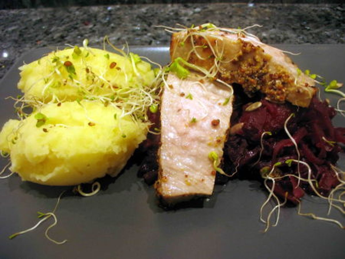 Porc à la moutarde et chou rouge braisé aux poires et au gingembre votez maintenant Platfacile1 heure Envoyer cette recette à un ami Imprimer cette page Poser une question à l'auteur Publier votre photo de cette recette Ingrédients 4 500g chou rouge 2 poires mûres un pouce de gingembre 250ml bouillon de volaille 2 cuillères à café vinaigre balsamique 50g noix un filet de porc d'environ 500-600g 2 cuillères à soupe huile neutre 2 cuillères à soupe moutarde à l'ancienne