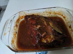 Placez la ensuite dans un plat de cuisson, et versez le mélange par dessus. Accrochez 2 feuilles de laurier sur la viande.