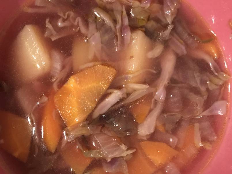 Ce potage au chou rouge est une soupe mijotée composée de chou rouge, carottes, oignons et pommes de terre, cuits dans un bouillon de bœuf aromatisé au vinaigre et au sucre. Les légumes sont d'abord revenus dans de la matière grasse avant d'être mijotés puis mixés pour obtenir une texture veloutée. Dégustez ce potage aux saveurs équilibrées où l'acidité du vinaigre et la douceur du sucre se marient pour un goût à la fois réconfortant et raffiné.