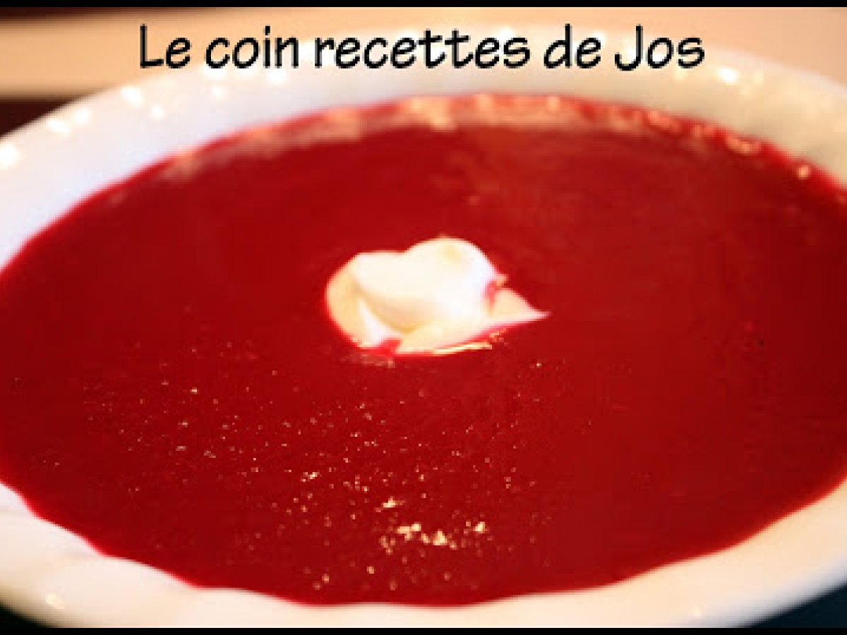 Potage de betteraves à la crème de raifort Platfacile40 min Envoyer cette recette à un ami Imprimer cette page Poser une question à l'auteur Publier votre photo de cette recette Ingrédients 2 8 betteraves pelées, coupées en morceaux de 1 po (environ 2 ¼ lb) 1 oignon espagnol haché 1 pomme de terre pelée et hachée 1 pomme, pelée et hachée 5 ¼ tasse de bouillon de poulet 2 cuillères à soupe de xérès sec ou vinaigre balsamique blanc 1 contenant de crème sure 2 cuillères à soupe de raifort en crème ¼ cuillère à thé de piment de Cayenne Sel poivre au goût