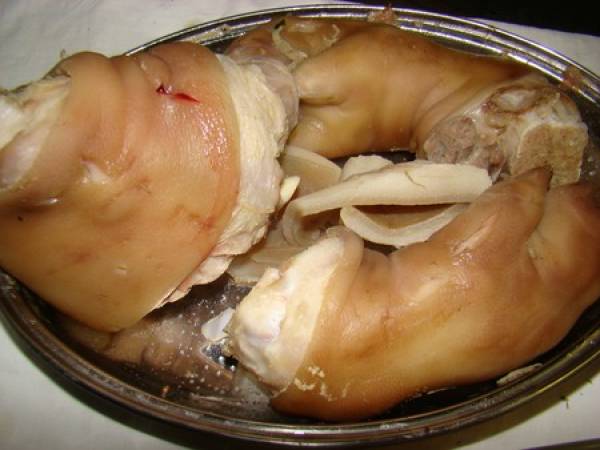 mettez les pieds de porc et le jarret , plus les deux oignons piqués