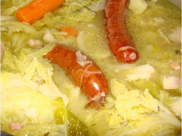 Jetez dans la marmite, les carottes , les saucisses piquées de coup de fourchettes, les pommes de terre, et le choux par dessus, éventuellement les cotes de porc.