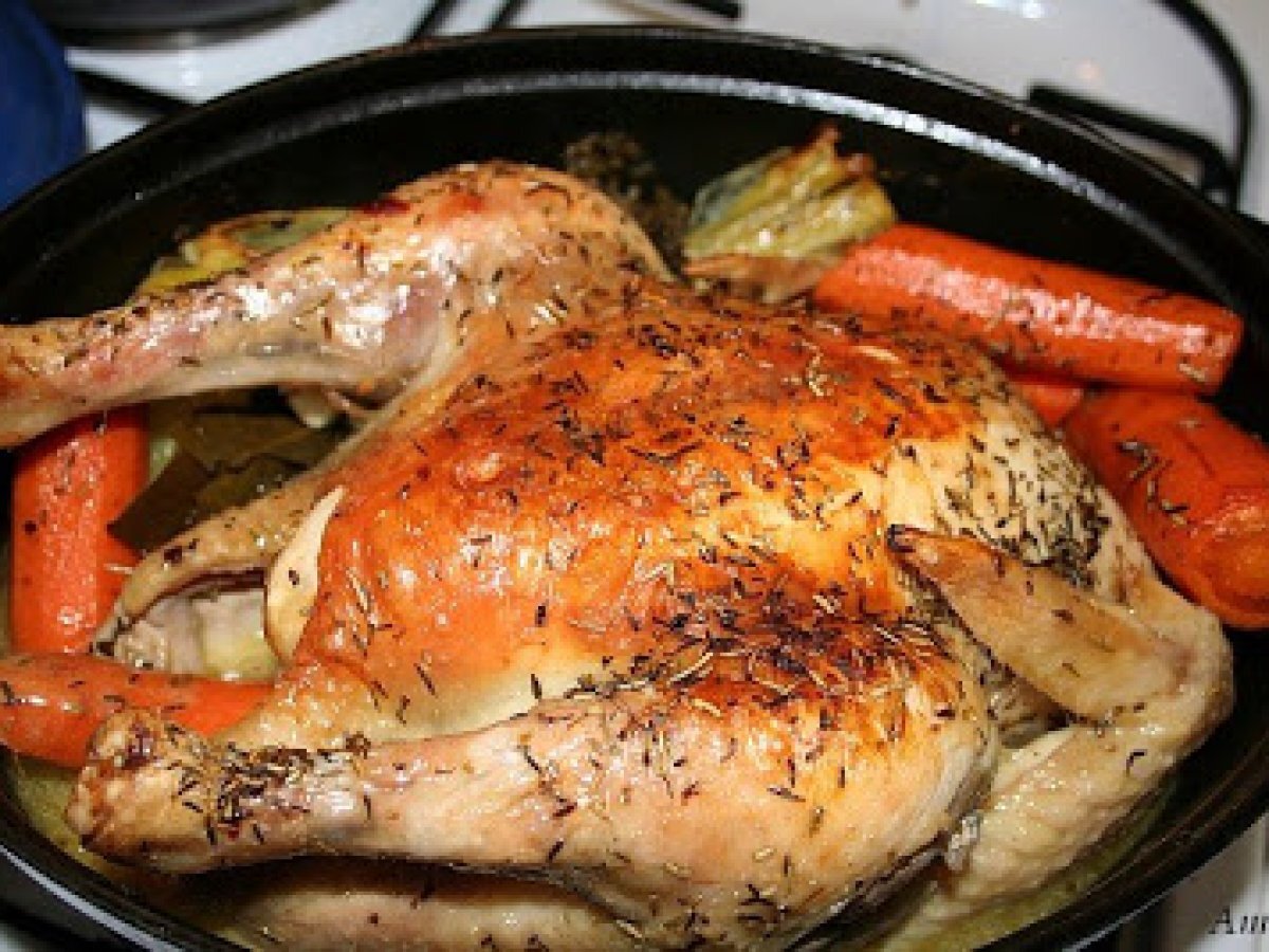 - Saisir la poularde dans la cocotte avec très peu d?huile. (Je trouve, que de la saisir, la chair est meilleure par la suite, elle n'est pas « lavée » par le bouillon). Préchauffer le four 200°