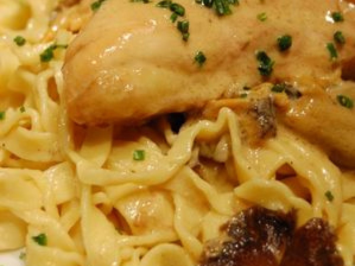 Ajouter les morceaux de poularde, les échalotes, le vin et le bouillon de volaille. - Laisser mijoter une bonne demi-heure à feu doux.