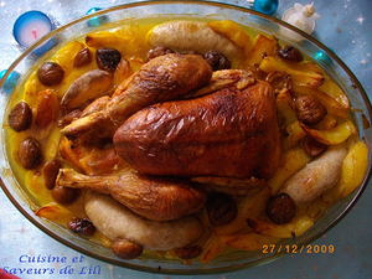 Poularde rôtie aux boudins blancs et aux marrons PrécédentSuivant Platfacile1 h 45 m Envoyer cette recette à un ami Imprimer cette page Poser une question à l'auteur Publier votre photo de cette recette Ingrédients 6 1 poularde 7 cuillères à café de fond de volaille 5 gros oignons 3 boudins blancs 250 g de marrons entiers naturels 600 g de rattes du Touquet 70 cl d'eau Sel et poivre