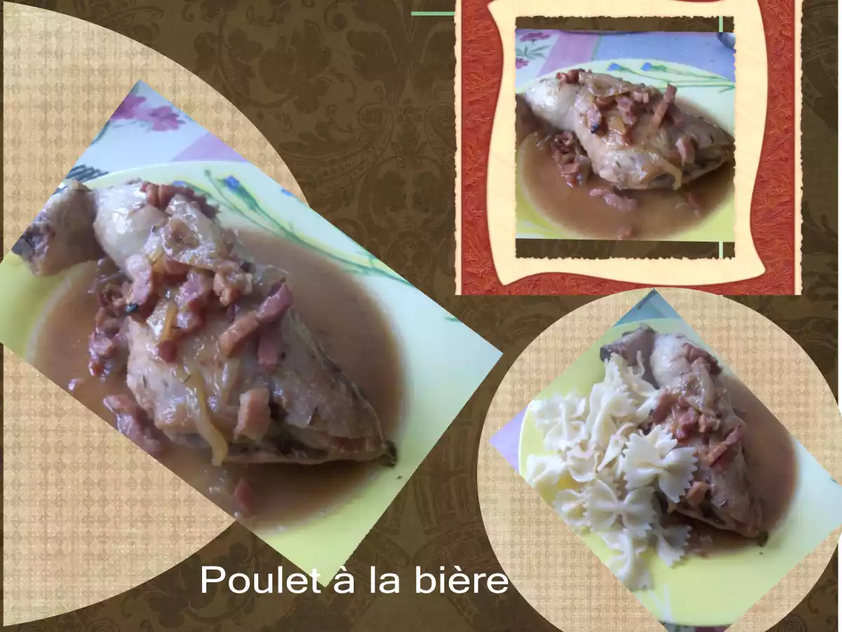 Poulet à la biere PrécédentSuivant Platmoyen50 min469 Kcal Envoyer cette recette à un ami Imprimer cette page Poser une question à l'auteur Publier votre photo de cette recette Ingrédients 4 4 cuisses de poulet 150g de lardons 2 oignons 300ml de bière d'abbaye quelques brins de thym 3CS de crème fraîche 3% sel et poivre Coût estimé: 6.17Euros€ (1.54€/part)