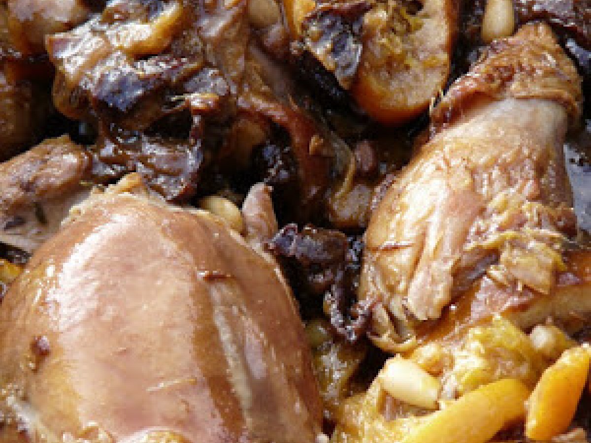 Poulet acidulé à l'orange , aux pignons et pruneaux