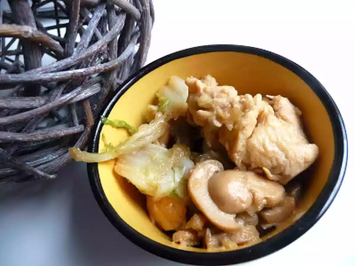 Poulet au chou chinois et champignons au thermomix Platfacile25 min256 Kcal Envoyer cette recette à un ami Imprimer cette page Poser une question à l'auteur Publier votre photo de cette recette Ingrédients 2 10 g de cacahuètes 1 oignon Gingembre 10 g d'huile d'olive 2 escalopes de poulet 15 g de sauce soja 15 g de nuoc man 1/2 cube de kubor 75 g d'eau 100 g de champignons 150 g de chou chinois