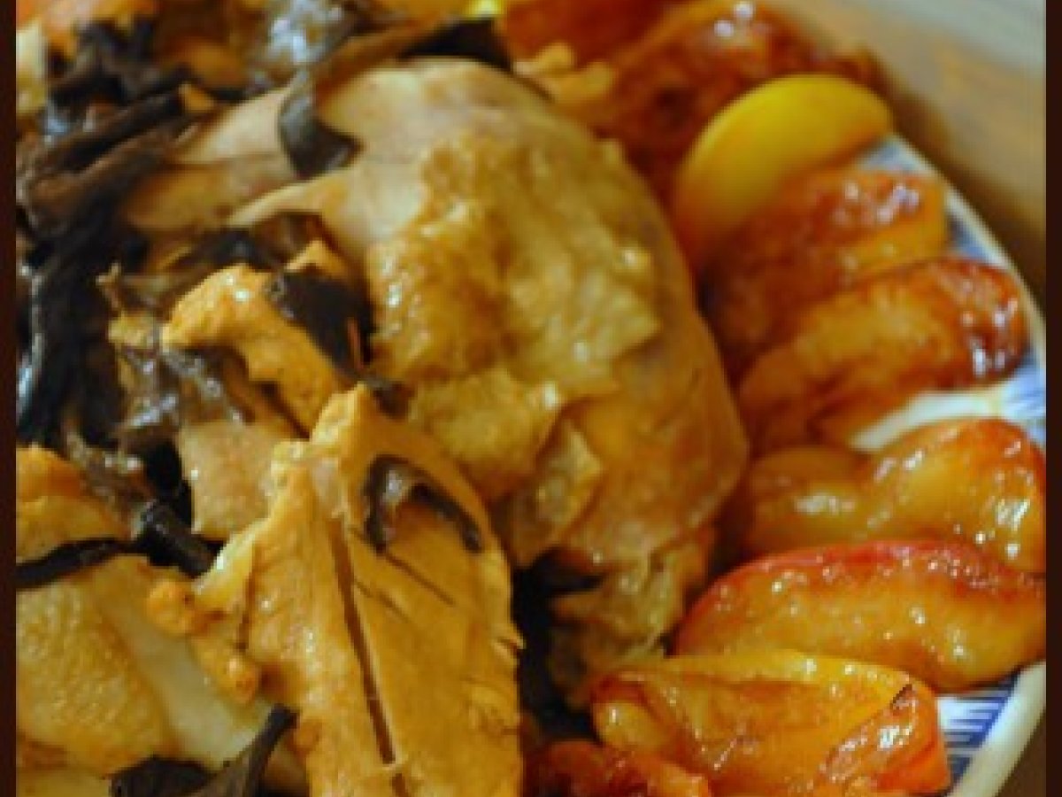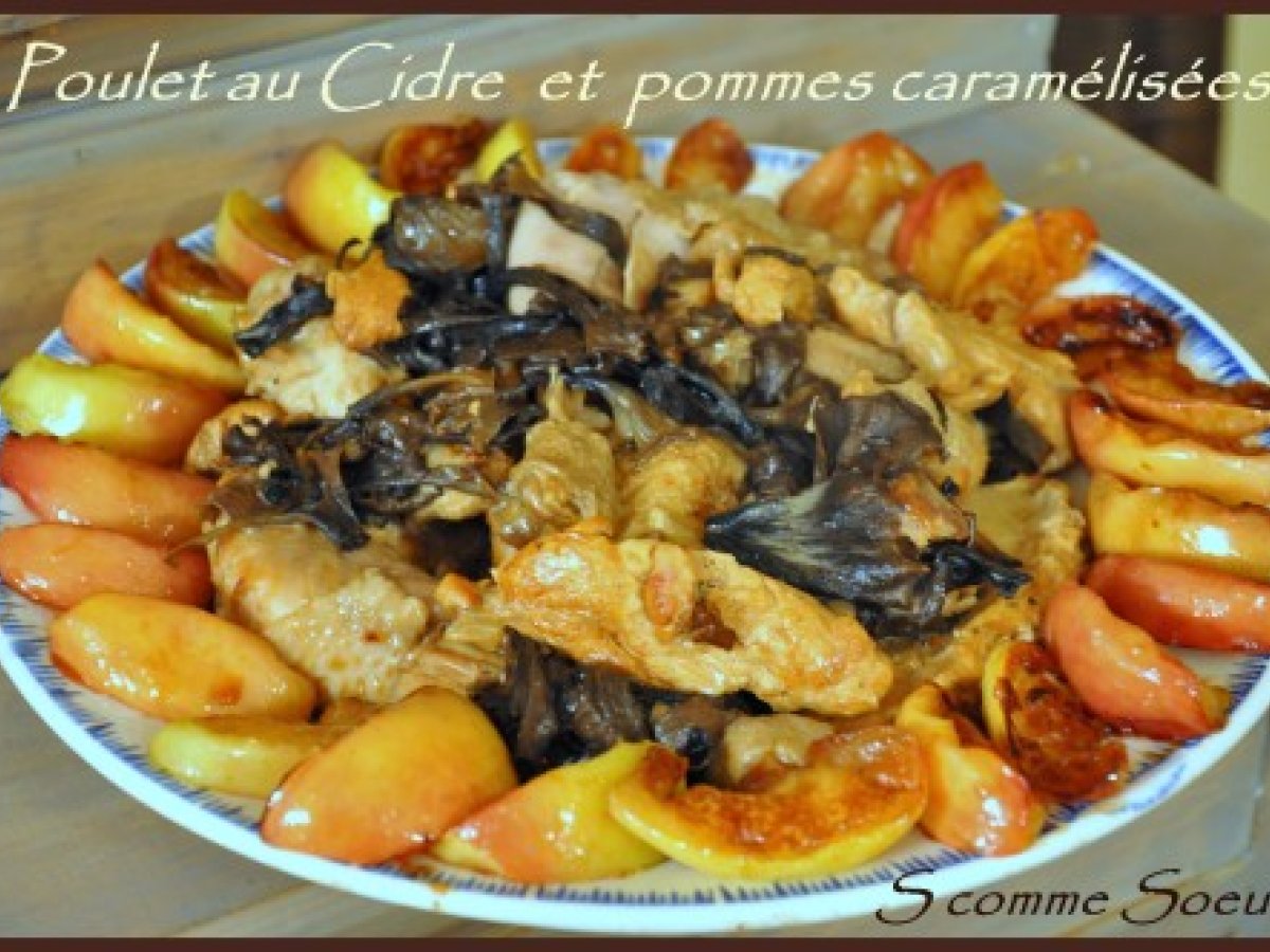 Poulet au cidre et pommes caramélisées votez maintenant PrécédentSuivant Platfacile1 h 5 m Envoyer cette recette à un ami Imprimer cette page Poser une question à l'auteur Publier votre photo de cette recette Ingrédients 6 1 poulet fermier coupé en morceaux 60 cl de cidre 40 g de beurre + 20 g 2 cuillères à café de fond de veau 4 pommes 50 g de sucre en poudre 25 g de trompettes de la mort déshydratées 6 cuillères à soupe de crème fraîche