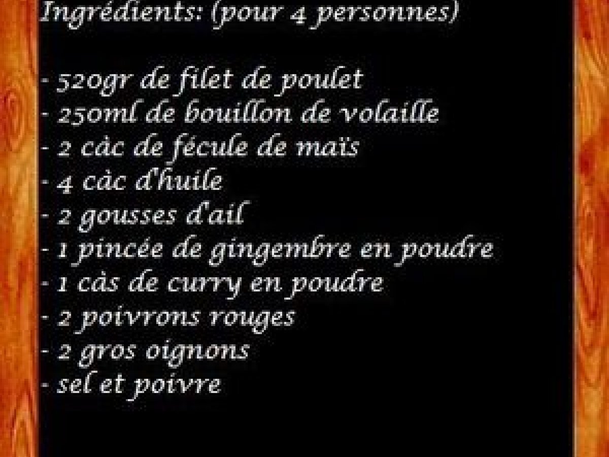 Poulet au curry et au poivron rouge ww PrécédentSuivant Platfacile25 min690 Kcal Envoyer cette recette à un ami Imprimer cette page Poser une question à l'auteur Publier votre photo de cette recette Ingrédients 2 520 g de filet de poulet 250 ml de buillon de volaille 4 cuillères à café de fécule de maîs 4 cuillères à soupe d'huile 2 gousses d'ail 1 pincée de gingenmbre en poudre 1 cuillère à soupe de curry en poudre 2 poivron rouges 2 gros oignons sel poivre Coût estimé: 8.17Euros€ (4.08€/part)